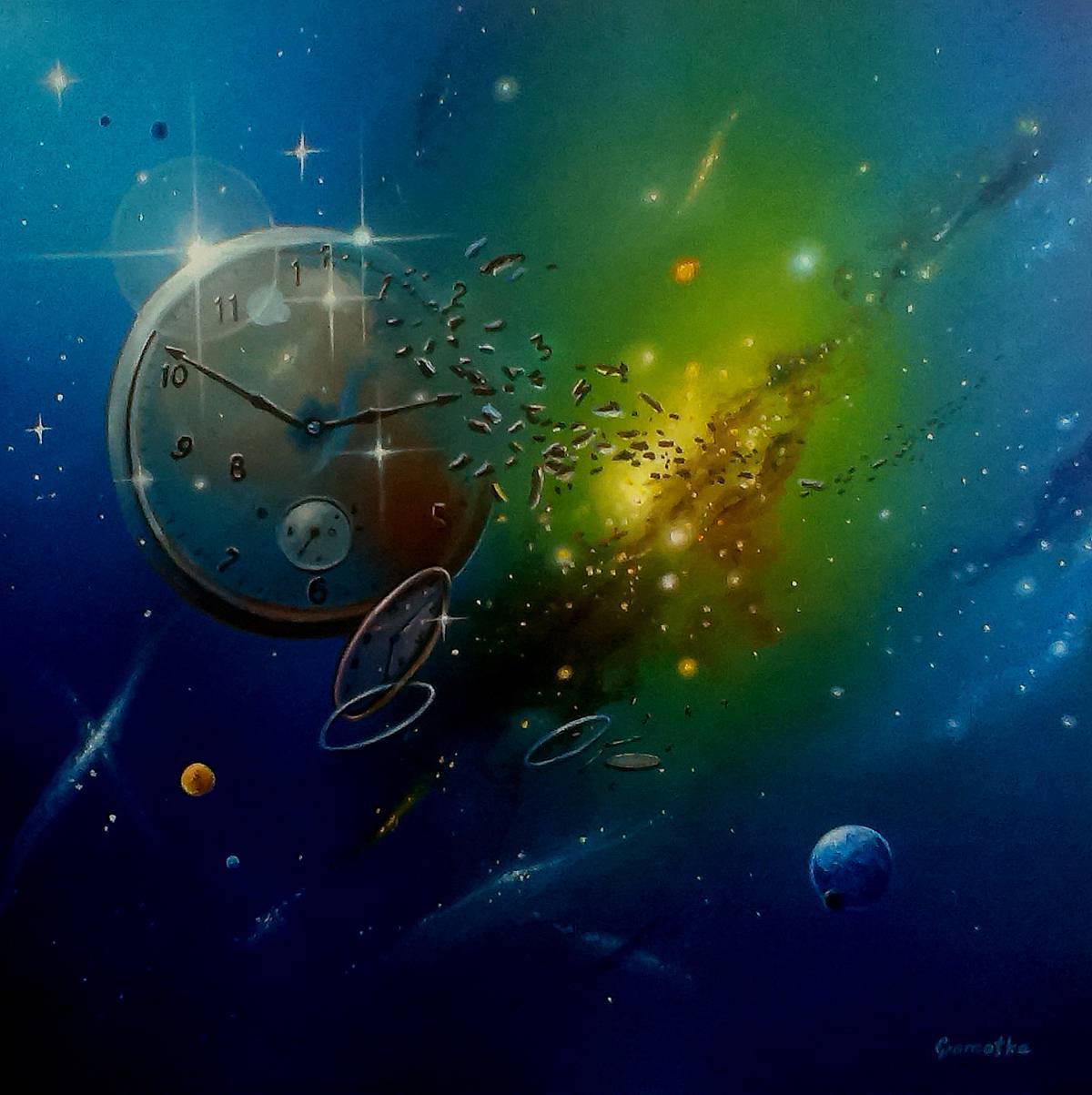 Na obrazie widzimy zegar zawieszony w kosmosie, który stopniowo się rozpada. Tarcza zegara zdaje się unosić w bezkresnym wszechświecie, otoczona przez rozproszone wskazówki i cyfry. Niebieskie i zielone odcienie tła nadają całości głęboki, niemal magiczny nastrój, jakby czas przestawał istnieć. Elementy kosmiczne, takie jak gwiazdy i planety, dopełniają surrealistycznej scenerii. Obraz emanuje tajemniczością i zadumą. Artysta posługuje się techniką, która przypomina malarstwo olejne, z wyraźnym naciskiem na miękkie przejścia kolorów. Atmosfera obrazu jest spokojna, ale jednocześnie niepokojąca. Rozpadający się zegar, niczym w slow motion, budzi refleksję nad ulotnością czasu. Look, czas dosłownie ucieka nam sprzed oczu! Dla niejednego odbiorcy może stać się metaforą nietrwałości życia i jego kruchości. Styl artysty łączy w sobie surrealizm z kosmicznym krajobrazem, co sprawia, że wszystko wydaje się jednocześnie bliskie i odległe. Patrząc na to dzieło, można poczuć się jak mała mróweczka w ogromnym wszechświecie. Jakbyśmy podglądali tajemnice czasu, które do tej pory były niedostępne. Obraz wzbudza emocje, zachęca do zatrzymania się na chwilę i przemyślenia. Jest jednocześnie piękny i melancholijny, jakby mówił: "czas nie czeka na nikogo".