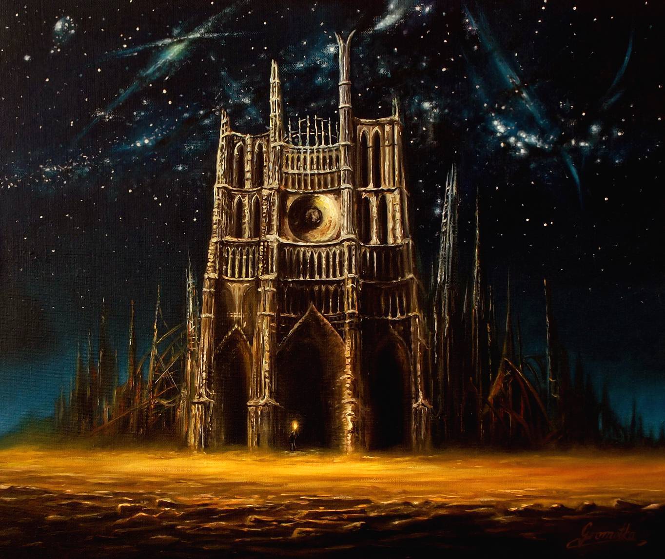 Na obrazie widzimy tajemniczą budowlę przypominającą gotycką katedrę, ale otoczoną surrealistycznymi elementami. Kolory dominujące to ciemne odcienie niebieskiego i czerni, które tworzą kosmiczne tło usiane gwiazdami. Kontrastuje z nimi złocisty blask, wydobywający się z wnętrza struktury, nadając jej magiczną aurę. Cała kompozycja jest osadzona w odrobinę złowrogim, ale jednocześnie fascynującym krajobrazie. Taki "wow" efekt robi prawdziwe wrażenie. Atmosfera obrazu jest ciężka, tajemnicza, wręcz mistyczna. Możemy poczuć dreszcz, ale też ciekawość, co skrywa ta gotycka konstrukcja. Styl artysty jest pełen detali, z precyzyjnie oddanymi elementami architektury. Technika malarska wskazuje na finezję w kreowaniu światła i cienia, co podkreśla dramatyzm dzieła. Oglądając ten obraz, można poczuć się jak w innej rzeczywistości. Wywołuje on emocje pełne zarówno lęku, jak i zachwytu. Czyż to nie przypomina trochę wizji z powieści science fiction? Witajcie w "dreamland"! Artysta sprytnie łączy klasykę gotyku z elementami nie z tego świata, tworząc dzieło, które na długo zapada w pamięć. To miejsce, gdzie nawet 7-letnie dziecko powiedziałoby: "Patrz mamo, to kosmiczny zamek!" Obraz prowokuje do refleksji nad przyszłością i niezmierzonym kosmosem, zachęcając do odkrywania nieznanego.
