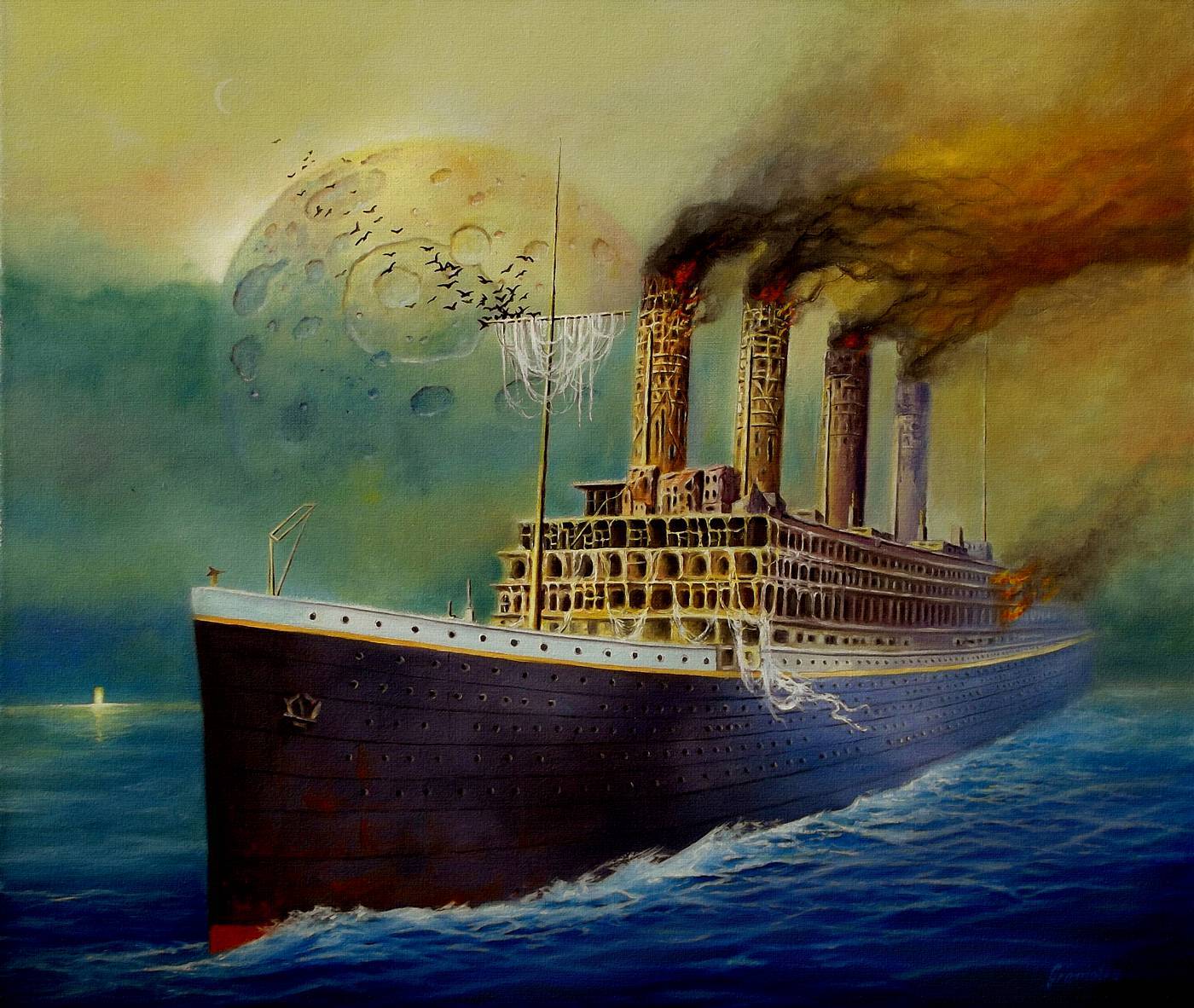 Na obrazie widzimy majestatyczny statek unoszący się po niespokojnym oceanie, otoczony przez mglistą kolorystykę błękitów, zieleni i żółci. Kształty mocno zaakcentowane, każdy detal tworzy przekonującą iluzję ruchu. Statek wydaje się prawie żywy, jego smukłe kadłuby przecinają wodę z energią, która wręcz hipnotyzuje. Na tle pojawia się ogromna, surrealistyczna tarcza, przypominająca księżyc w pełni, ozdobiona pędem ptaków, które lecą w nieznane. Atmosfera obrazu emanuje tajemniczością i niepokojem. Styl użyty przez artystę to mieszanka realizmu i surrealizmu, gdzie detale techniczne statku spotykają się z nieziemską obecnością kosmicznych elementów. Kolory są stonowane, a jednocześnie nasycone, co tworzy strong kontrast między dramatycznym niebem a spokojnym oceanem. Obraz budzi uczucia nostalgii i refleksji, zmuszając do zastanowienia się nad podróżą życia i nieuchronnością losu. Jak patrzę na ten obraz, czuję almost melancholiczny nastrój, jakby statek symbolizował marzenie ulotne w obliczu wszechświata. To jest mój statek z bajki! - powiedziałby siedmiolatek. Widać tu mistrzostwo w gry z emocjami widza, gdzie każda linia, każdy cień ma swoje miejsce i swoje znaczenie. Obraz prowokuje do osobistych przemyśleń, od skierowania wzroku poza horyzont, po wejrzenie w głąb samego siebie.