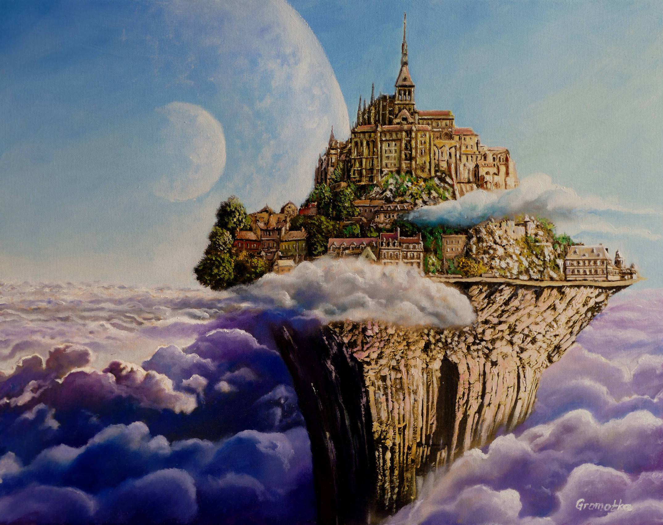 Obraz przedstawia zawieszone w powietrzu miasto, otulone miękkimi chmurami w odcieniach fioletu i różu. To niczym senna wizja, gdzie majestatyczny zamek dominuje nad resztą budynków zbudowanych z ciepłych, ziemistych kolorów. Na niebie widać blady księżyc, dodający tajemniczości i magicznego klimatu. Kompozycja jest dynamiczna, prowadząc wzrok ku górze, ku bezkresnemu niebu. Atmosfera obrazu jest jak z bajki, tajemnicza i jednocześnie pełna spokoju. Wyobraźnia artysty wydaje się nieograniczona, a jego technika - prawie jak z innego świata. Widać tu precyzyjne pociągnięcia pędzlem, które nadają strukturę i głębokość. Emocje, które obraz wywołuje, to mieszanka zachwytu i nostalgii za światem wyobraźni. Myśl o tym, że kroczysz uliczkami tego miasta na chmurze, jest niezwykle kusząca. "It's like a dream," mogłoby pomyśleć dziecko patrząc na to dzieło. Obraz zachęca do refleksji nad tym, co jest możliwe w nieograniczonej przestrzeni naszej fantazji.