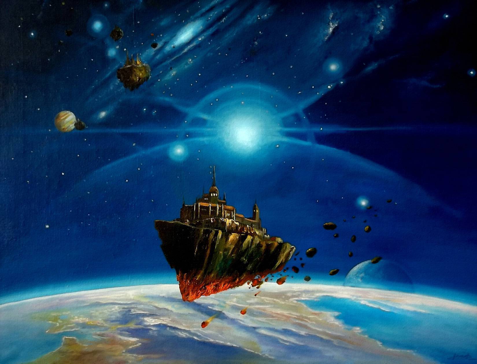 Obraz przyciąga wzrok niezwykłym połączeniem przestrzeni kosmicznej i fantastycznej architektury. Na pierwszym planie widać ogromną skalną wyspę unoszącą się nad powierzchnią planety. Na jej szczycie znajduje się tajemniczy zamek o wieżyczkach przypominających średniowieczne twierdze. Kolory w tej pracy są żywe i kontrastowe, dominują głęboki granat i intensywna zieleń. Niesamowicie jasne słońce w tle dodaje dramatyzmu całej scenie, rozpraszając się na kobaltowym niebie w formie błyszczących komet i gwiazd. Wow, ale to gigantyczne! Artysta uchwycił atmosferę tajemnicy i niepewności, wykorzystując techniki realistyczne z nutą surrealizmu. Detale kamiennych wież i kraterów wokół zamku są niesamowicie precyzyjne, co przyciąga wzrok do centrum obrazu. Ta praca może budzić w widzu uczucie wonder, jakbyśmy byli na krawędzi nowego odkrycia. Czy to sen? A może jakaś inna rzeczywistość, równoległe uniwersum pełne niespodzianek? Patrząc na dzieło, zastanawiam się, jaki jest cel tej podróży na kosmicznej wyspie. Czasem wydaje mi się, że to tylko odłamek naszej ukrytej wyobraźni, zaproszenie do refleksji i marzeń.