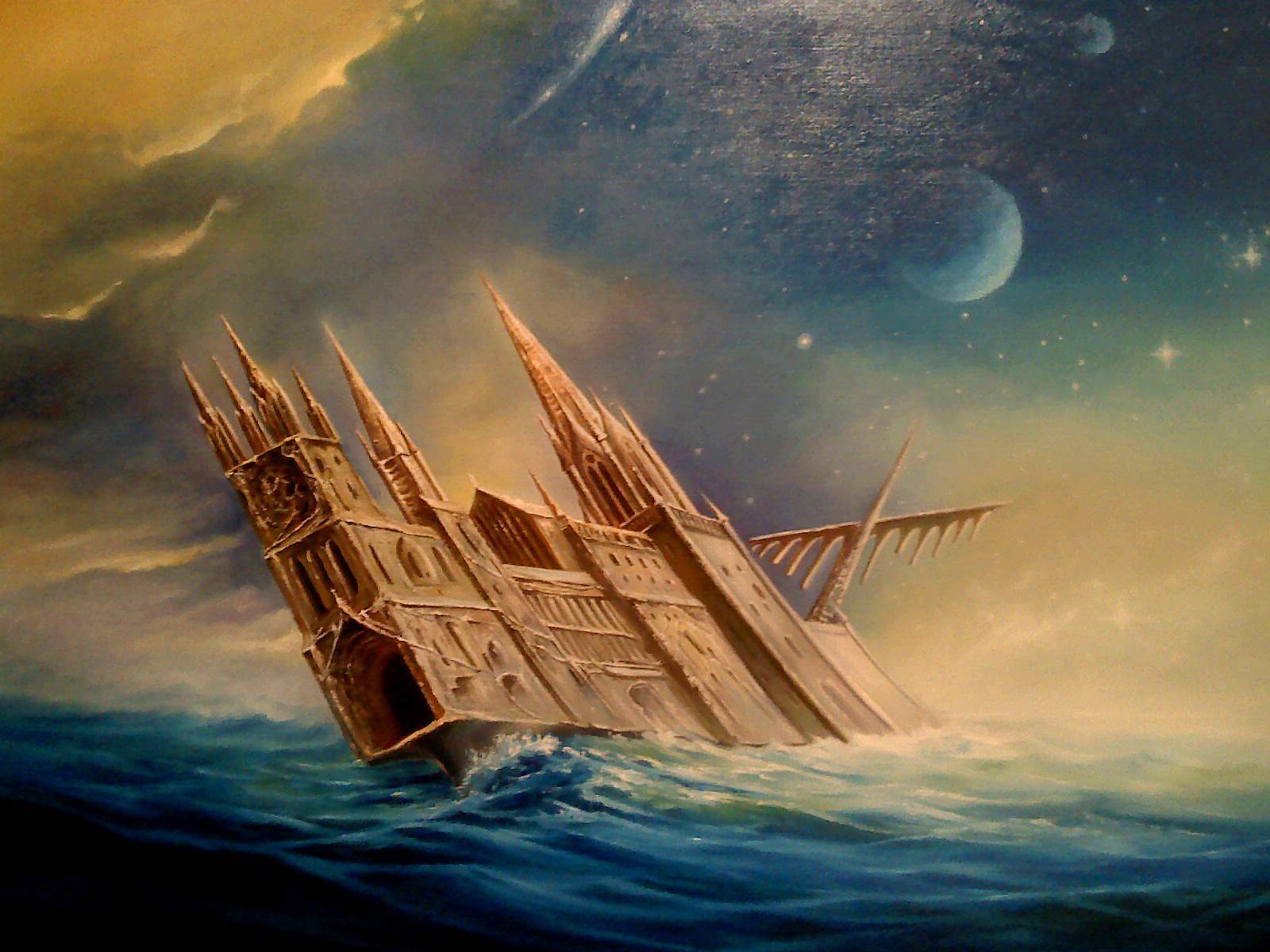 Na obrazie widzimy niezwykłą katedrę, która unosi się na wzburzonym oceanie. Jej strzeliste wieże wznoszą się ku niebu, które jest pokryte gwiazdami i dwoma księżycami. Kolory są intensywne, dominują głębokie odcienie niebieskiego, przechodząc w ciepłe żółcie na horyzoncie. Obraz ma w sobie coś magicznego, jakby katedra przemierzała kosmiczne przestrzenie. Styl artysty jest surrealistyczny, łączy szczegółowość gotyckiej architektury z fantastycznym światem marzeń. Kształty są precyzyjne, ale równocześnie wydają się nierealne, jak z bajki. Ten obraz może wywołać w widzu uczucie zachwytu i ciszy, a także nutę niepokoju – czy to miejsce jest prawdziwe, czy tylko senne marzenie? Patrząc na to dzieło, myślę o podróży, o odkrywaniu nowych światów. Wow, taka wielka katedra na wodzie! – powiedziałoby dziecko. Obraz jest pełen emocji, a jego interpretacja zależy od nas. Czy to symbol odrodzenia? Może pragnienia ucieczki? A może po prostu piękna utopia? Ach, te niesamowite nawiązanie do dream-like scen, zostają na długo w pamięci.
