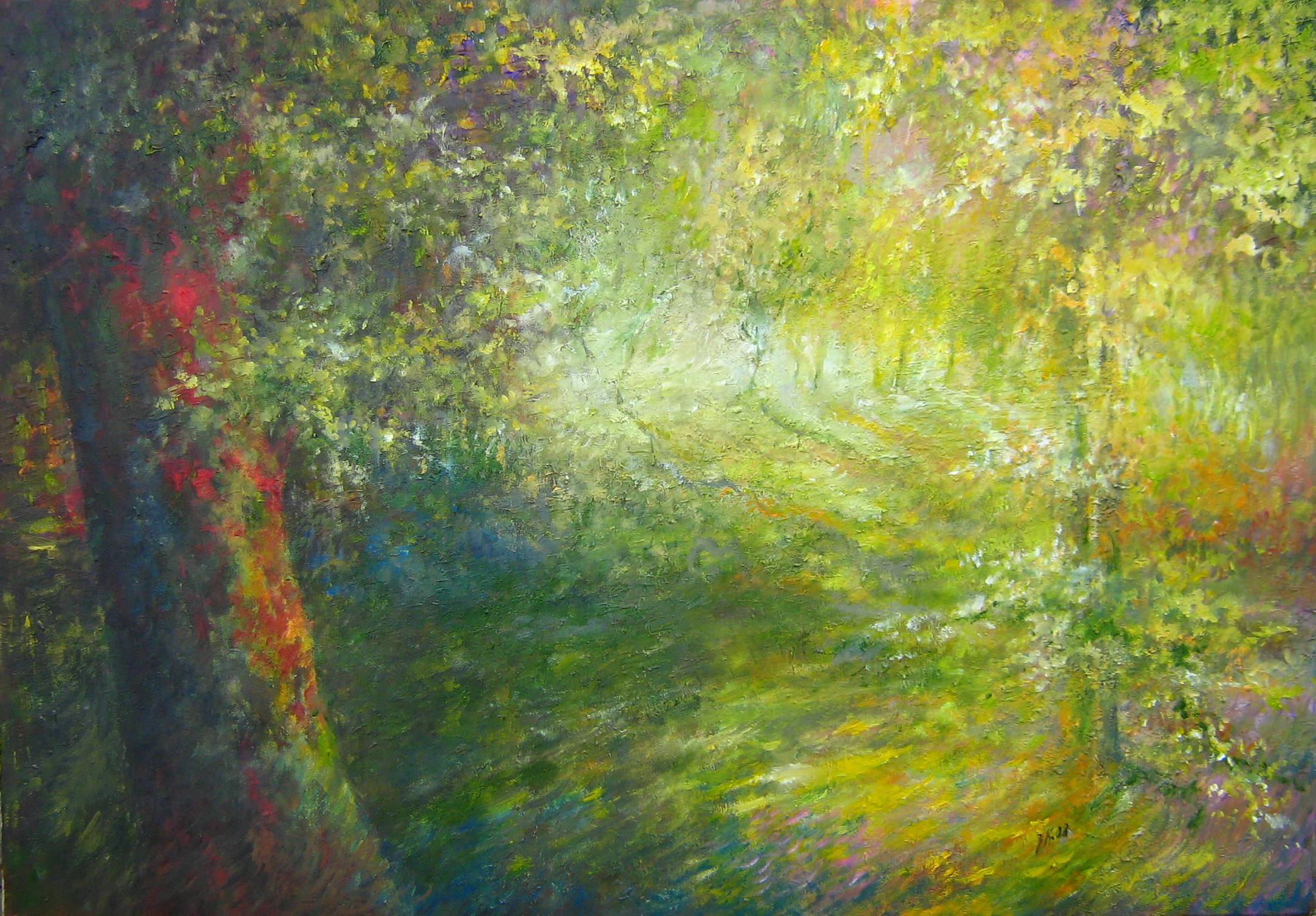Obraz pełen barw, które niemal tańczą przed oczami. Dominuje zieleń, ale wzbogacona o tajemnicze odcienie czerwieni i żółci, co nadaje dziełu życia. Dominują miękkie, rozmyte kształty, przypominające zagajnik skąpany w świetle wschodzącego słońca. Kompozycja jest bliska impresjonistycznemu podejściu, gdzie liczy się wrażenie i ulotność chwili. Atmosfera jest spokojna, niemal sielankowa, co budzi nostalgię za beztroskimi dniami. Ale czy na pewno to tylko las? Może to kraina z naszych snów? Artysta posłużył się techniką impasto, co widać w grubościach nałożonej farby. Dzięki temu kolory stają się pełniejsze, bardziej tangible, jakby można było ich dotknąć. Całość tworzy aurę bajki, coś jak stary, zaczarowany las, który przyciąga tajemnicą. Patrząc na to dzieło, zaczynam myśleć o spacerach w letni dzień. W ustach czuć smak przygody, a serce bije szybciej z emocji. Obraz mówi do nas językiem natury. Jakby szepcząc: spójrz, to magic! Czas na osobistą refleksję – jestem tu, w tym momencie, i czuję, że jestem częścią czegoś większego.