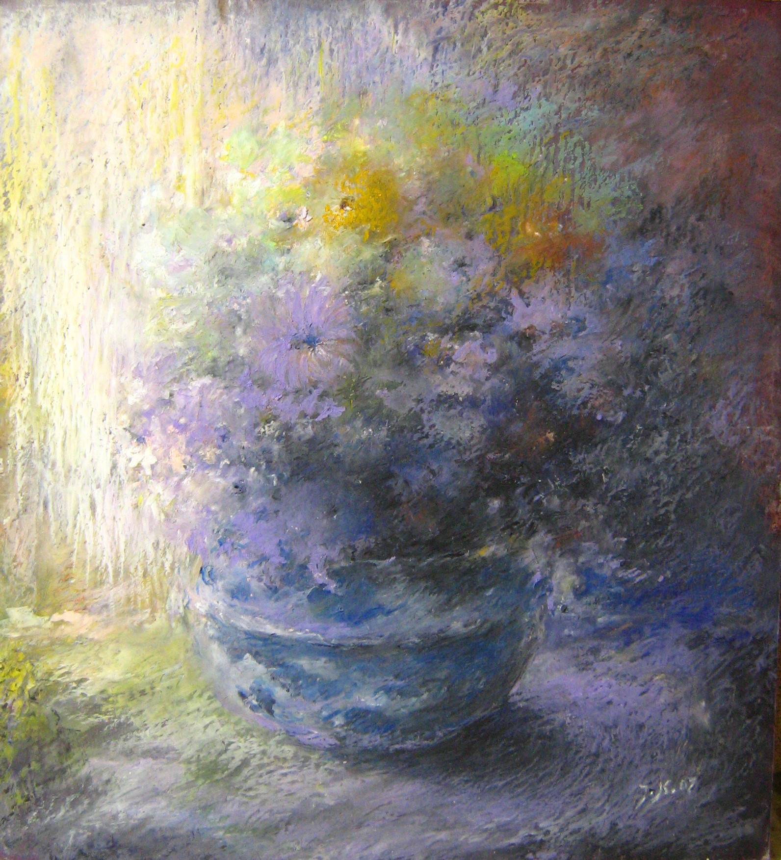 Na obrazie widzimy delikatną kompozycję, gdzie wazon z kwiatami zdaje się niemal ulotny. Kwiaty, rozmyte jakby we mgle, emanują pastelowymi kolorami fioletu, różu i żółci. Tło jest miękkie, pełne ciepłych, złocistych tonów, które dodają dziełu blasku oraz atmosfery nostalgii. Faktura płótna zdaje się być niemal dotykalna, jakby artysta zamienił ruch pędzla na szelest wiatru. Malowane światło przemyka subtelnie przez kwiaty, przywodząc na myśl letnie poranki. Styl artysty jest impresjonistyczny, pełen emocji i spontaniczności. Technika warstw nakładanych farb daje wrażenie głębi i ruchu. Czuję zachwyt patrząc na te subtelne przejścia kolorów. Obraz może przywołać domyślną radość, może też zadumę nad pięknem ulotnych chwil. Myślę sobie: „Ale to ładne, mama chce takie w domu”. Kompozycja jest dynamiczna, choć zachowuje spokój. Kwiaty przywołują wspomnienia dzieciństwa i letnich spacerów. To miejsce, gdzie można uciec i poczuć "peace". Czuć swobodę i lekkość w każdym ruchu artysty, tak jakby uchwycił chwilę marzenia.