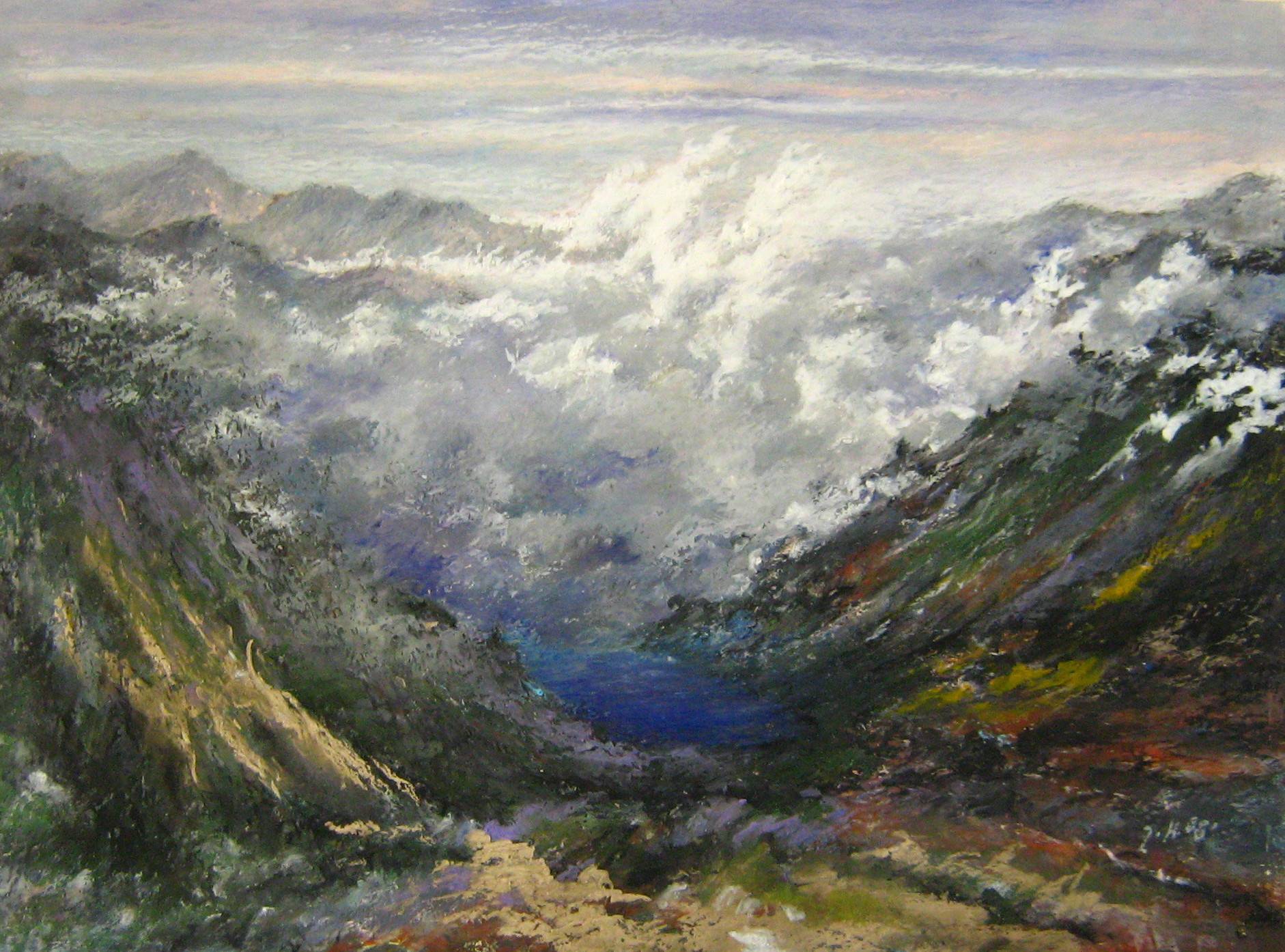 Na obrazie dominuje spektakularne połączenie chłodnych odcieni błękitu, szarości i zieleni, porwanych przez głębokie zawirowania białych chmur. W centrum widzimy mistyczną dolinę, jakby zanurzoną w tajemniczej mgle. Kształty są nieco rozmyte, nadając kompozycji marzycielski, eteryczny charakter. To wygląda jak magiczne miejsce, które można zobaczyć tylko w snach. Atmosfera dzieła jest pełna spokoju i kontemplacji, a jednocześnie odrobinę niepokojąca, kiedy uświadomimy sobie ogrom chmur kłębiących się w dolinie. Styl artystyczny można opisać jako impresjonistyczny, z luźnymi pociągnięciami pędzla, które tworzą dynamiczne tekstury. Obraz może wywoływać fascynację i zadumę nad siłą natury. Czuję, jakby można było wziąć głęboki oddech i poczuć świeżość powietrza. Ten landscape pokazuje piękno natury w pełnej krasie. "Wow, ale dużo chmur", powiedziałoby dziecko. Patrząc na to dzieło, zaczynam snuć marzenia o podróży w nieznane, gdzie horyzont jest zawsze o krok dalej. Jedno jest pewne, artysta przekazał tutaj emocje, które trafiają prosto do serca. Feeling of awe jest trudne do opisania, ale łatwo go doświadczyć patrząc na ten obraz.