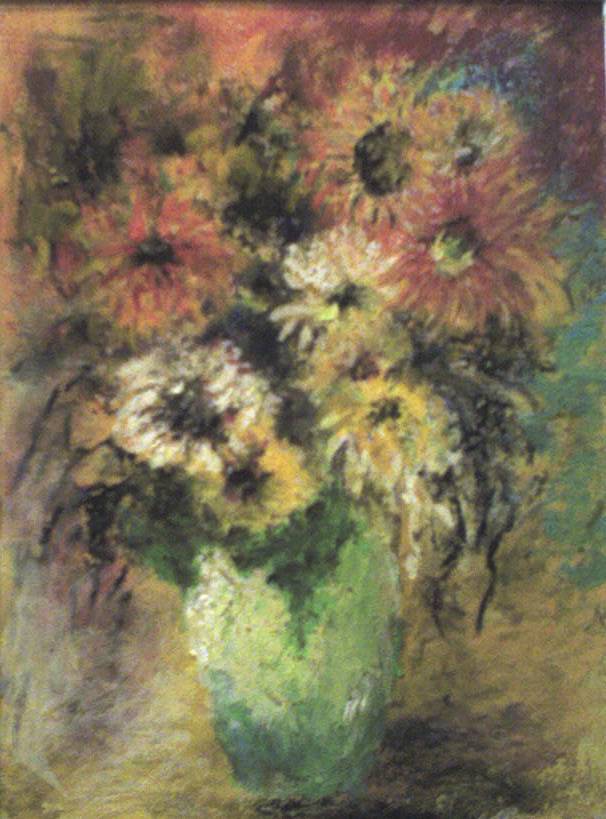 Obraz przedstawia bukiet kwiatów w wazonie, który emanuje ciepłymi kolorami. W kompozycji dominują żółcie, czerwienie i odcienie zieleni, które wirują niczym kolorystyczny taniec. Wazon jest w odcieniu pastelowej zieleni, kontrastując z intensywnością barw kwiatów. Patrząc na płótno, ma się wrażenie, że kwiaty delikatnie kołyszą się na wietrze, jakby artysta uchwycił chwilę z letniego dnia. Atmosfera dzieła jest spokojna i nostalgiczna, przywołująca na myśl letnie wspomnienia. Tak jakby słońce wpadało przez okno, oświetlając wnętrze. Styl, w jakim zostało namalowane to coś z pogranicza impresjonizmu, z charakterystycznym dla tej epoki rozmyciem kształtów i miękkimi, swobodnymi pociągnięciami pędzla. Technika artystyczna wywołuje wrażenie głębi i dynamiki, mimo statyczności tematu. Odbiorca może poczuć nostalgiczne wspomnienia dzieciństwa, gdy bawił się wśród kwiatów. To jest takie sweet. Obraz skłania do refleksji nad ulotnością życia i pięknem chwili. Artysta zastosował technikę, która zdaje się mówić: "capture the moment". Wydaje się, że to, co tak ulotne jak życie, zawarło się w tej kolorystycznej eksplozji. Obraz budzi emocje i pozostawia trwałe wrażenie w sercu widza.