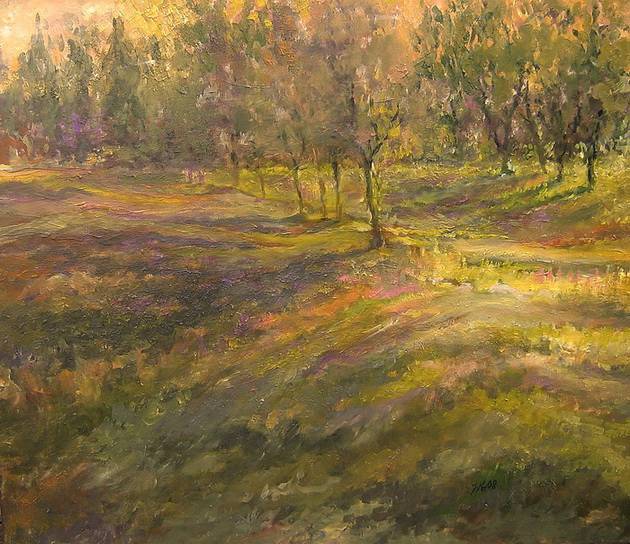 Na obrazie dominują ciepłe, złote i zielone tony, tworząc wizualną symfonię, która przypomina letnie popołudnie. Krajobraz pełen falujących liści i miękkich cieni zdaje się zapraszać do wędrówki przez spokojną, idylliczną krainę. Kompozycja skupia się na centralnej części, gdzie drzewa rzucają długie cienie na wzgórza, tworząc interesującą grę światła i cienia. Atmosfera jest magiczna, niemal eteryczna, a obraz wydaje się emować spokojem i beztroską. Styl artysty przypomina impresjonizm, gdzie szybkie, delikatne pociągnięcia pędzla oddają nieuchwytny moment natury. Technika sfumato rozwiewa granice między obiektami, dodając uczucie głębi i nostalgii. Na pierwszy rzut oka obraz może wydawać się prosty, ale kryje w sobie mnóstwo subtelnych detali, które prowokują do refleksji. Ta scena naprawdę budzi ciepło w sercu. Patrząc na ten obraz, czujesz soft embrace natury. Może przypomnieć ci dzieciństwo, kiedy świat wydawał się pełen tajemnic do odkrycia. Moja siostra mówi, że tam jest ukryty króliczek! To jak opowieść o miejscach, do których chcemy wracać myślami. Dla kogoś innego może być to moment zamyślenia, chwila zatrzymania się w biegu codzienności. Artysta uchwycił coś więcej niż tylko krajobraz; to emocje, marzenia i wspomnienia splecione w jednym płótnie. Coś w tym obrazie naprawdę wciąga.
