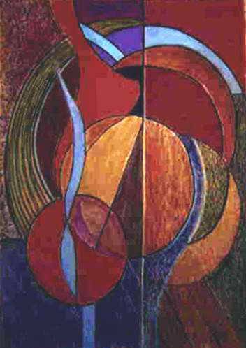 Na obrazie widzimy niezwykłą mozaikę kształtów i kolorów. Dominują ciepłe odcienie czerwieni, pomarańczu i złota, które mieszają się z chłodnymi tonami błękitu i fioletu. Kompozycja jest dynamiczna, pełna zaokrąglonych form i przecięć, które tworzą wrażenie ruchu. Artysta używa technik geometrycznego abstrakcji, gdzie proste linie i krzywizny łączą się w harmonijną całość. Nastrój tego dzieła jest pełen energii i tajemnicy. Każdy element wydaje się być na swoim miejscu, a jednocześnie wzywa do zgłębienia swojej historii. Można by rzec, że obraz "żyje" własnym życiem. Czuję się jakbym patrzył na coś magicznego, coś nieuchwytnego. To jest jak kalejdoskop emocji, czyli rollercoaster wrażeń. Dzieciak mógłby powiedzieć: "Te kolory są jak czerwony balon i błękitne morze!". Ta praca jest prawdziwym "masterpiece" w swoim minimalistycznym stylu. Widz wchłania widok, wyrywając się z rzeczywistości na kilka chwil. Pozwala sobie na chwilę refleksji, odłączając się od codziennych problemów. Odbiorca zastanawia się nad sensem tych kombinacji, co artysta mógł mieć na myśli tworząc taki splot form? Może to odzwierciedlenie chaosu w harmonii naszego świata. Gdy patrzę na ten obraz, czuję wewnętrzną niepewność, ale i spokój. To prawdziwa zagadka zamknięta w cieniu linii i łuków.