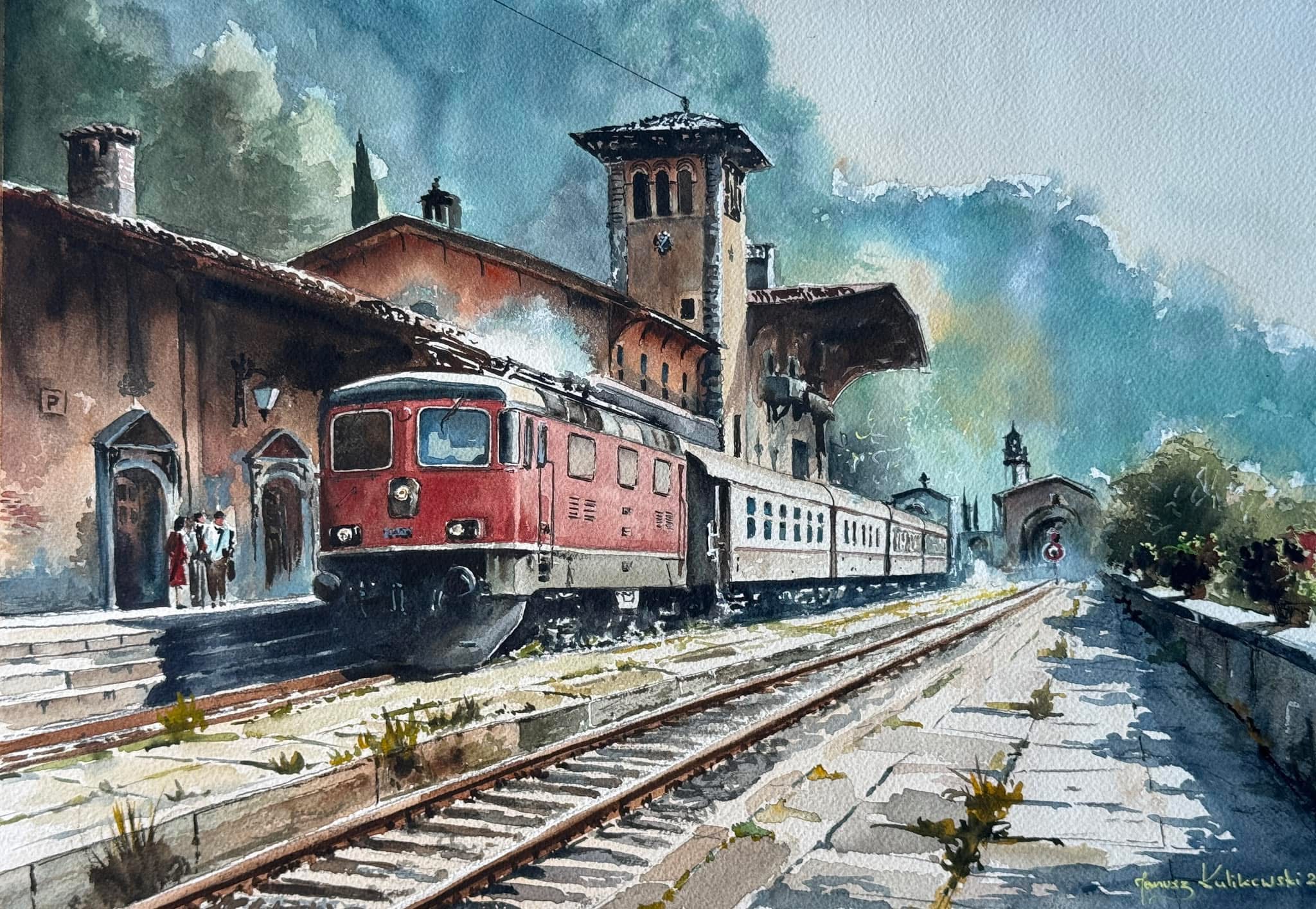 Akwarela pokazuje kameralną stację u podnóża wzgórz, czerwony lokomotyw na przodzie i biały skład znikający w perspektywie torów. Chłodne błękity mgły przenikają ochry murów i ciemne brązy dachu, a dym miękko rozlewa się po papierze. Kompozycja diagonalna prowadzi oko do łuku tunelu i drobnego semafora. Pociąg jest duży i robi puff puff. Nastrój półspokojny, troszkę senny, jak w chwili tuż przed odjazdem, kiedy człowiek łapie oddech. Widać mokre na mokre, lekką granulację, a suchy pędzel akcentuje szyny i krawędzie peronu. Czuję wilgoć, rdzę i małe bicie serca, robi mi się nostalgic w srodku. To obraz o podróży i pamięci, o tym że miejsca trzymają nasze kroki, nawet jeśli my już pędzimy dalej.