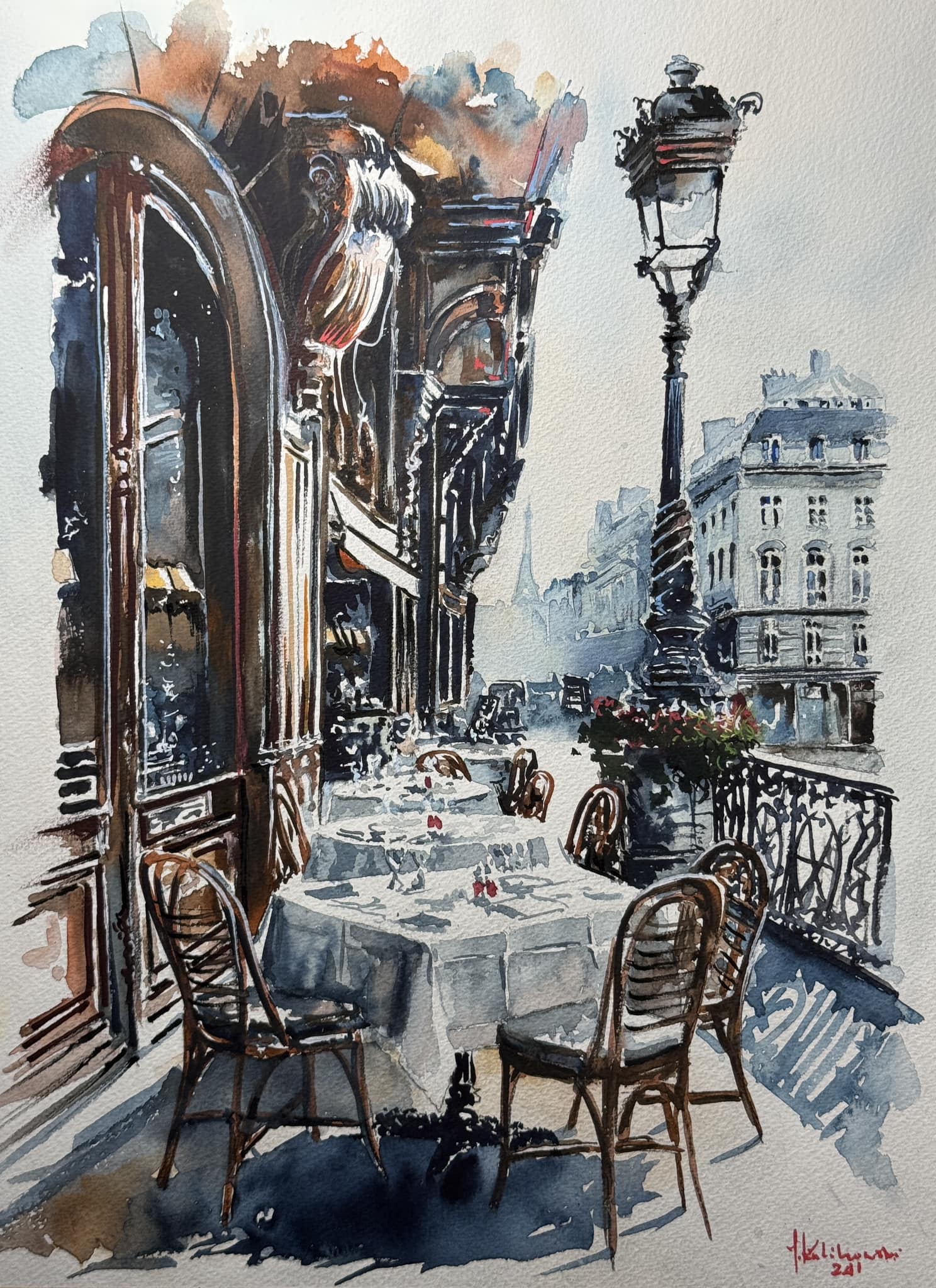 Akwarela pokazuje taras kawiarni z okrągłymi stolikami, wiklinowymi krzesłami i smukłą latarnią, widziany z lewej w perspektywie ku chłodnym fasadom. Kolory zderzają ciepłe brązy i rudą siennę z granatami cieni i rozbielonym niebem. Kompozycja prowadzi oko od bogatych ornamentów nad wejściem w stronę lekkiej mgiełki ulicy. Widać chlapania, mokre w mokrym, ostre kreski tuszu i malowanie światłem zostawionym z papieru. Atmosfera poranka, nostalgiczna, ale żywa jakby przed otwarciem. Szczerze, aż chce się usiąść i posłuchać stukotu filiżanek. Chciałbym tu zjeść lody i patrzeć na lampę. Ten obraz ma paryski vibe. Jest tu bałagan i krzywe krawędzie, lecz te niedoskonałosci dodają serca i aromatu kawy.