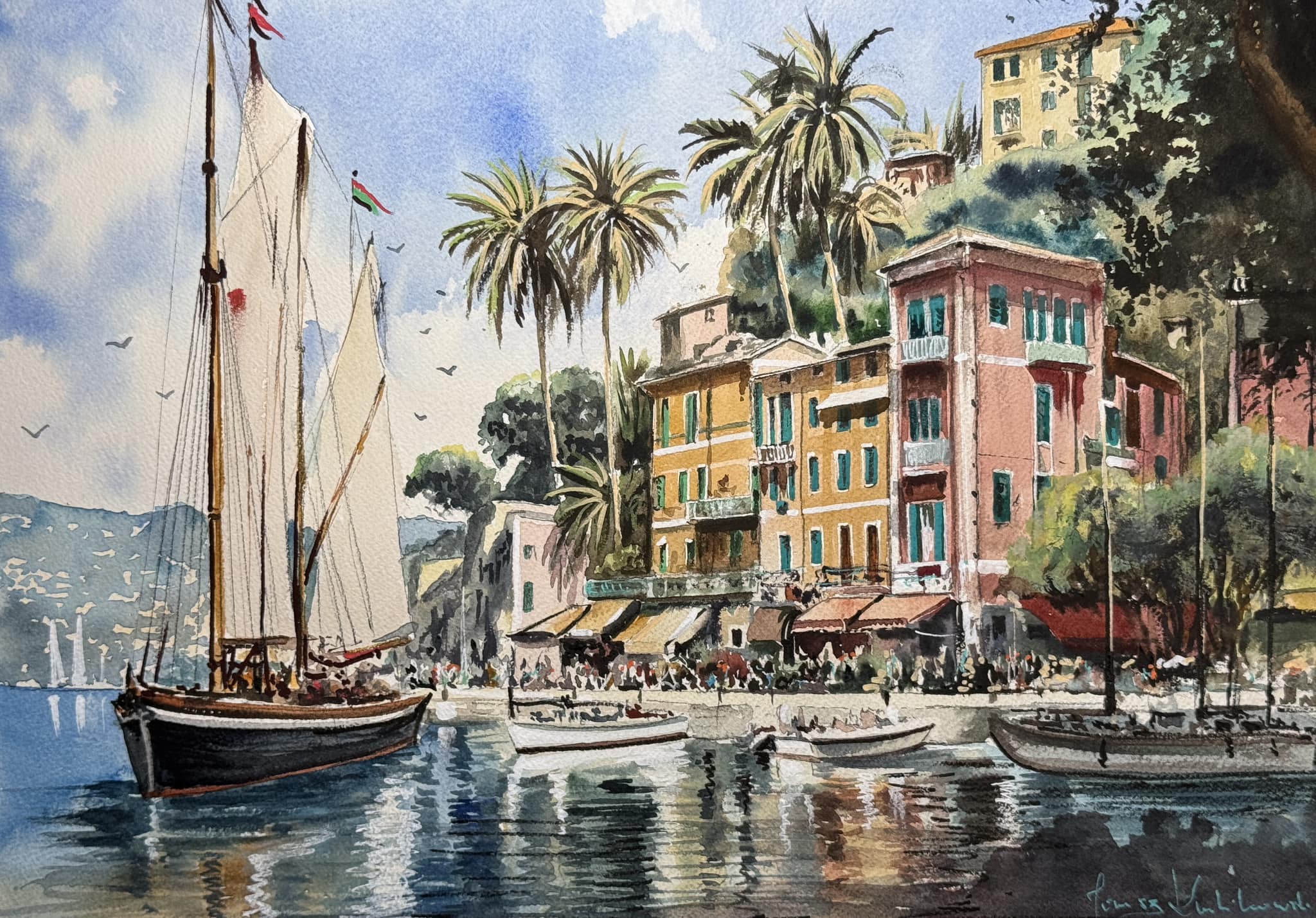 Akwarela pokazuje port śródziemnomorski, z łodziami kołyszącymi się na wodorze i fasadami w różu, ochrach i zieleni, które odbijają się w lśniącym lustrze zatoki. Po lewej smukły żaglowiec z kremowymi żaglami równoważy kadr, po prawej piętrzą się palmy i domy, wszystko spina wielki błękit nieba. Łódka jest wielka i płynie po błękitnej wodzie. Atmosfera wakacyjna, lekko gwarna, ale bez pośpiechu, taki spokojny vibe. Pociągnięcia pędzla luźne, mokre na mokrym, z laserunkami na wodzie, a maszty podkreślone ostrą kreską tuszu. Czuję słony zapach i ciepło, oraz tęsknotę, jakby popołudnie miało spłynąć w złoto. Krzywe okienka dodają uroku. Dla mnie to opowieść o ruchu i odpoczynku naraz.