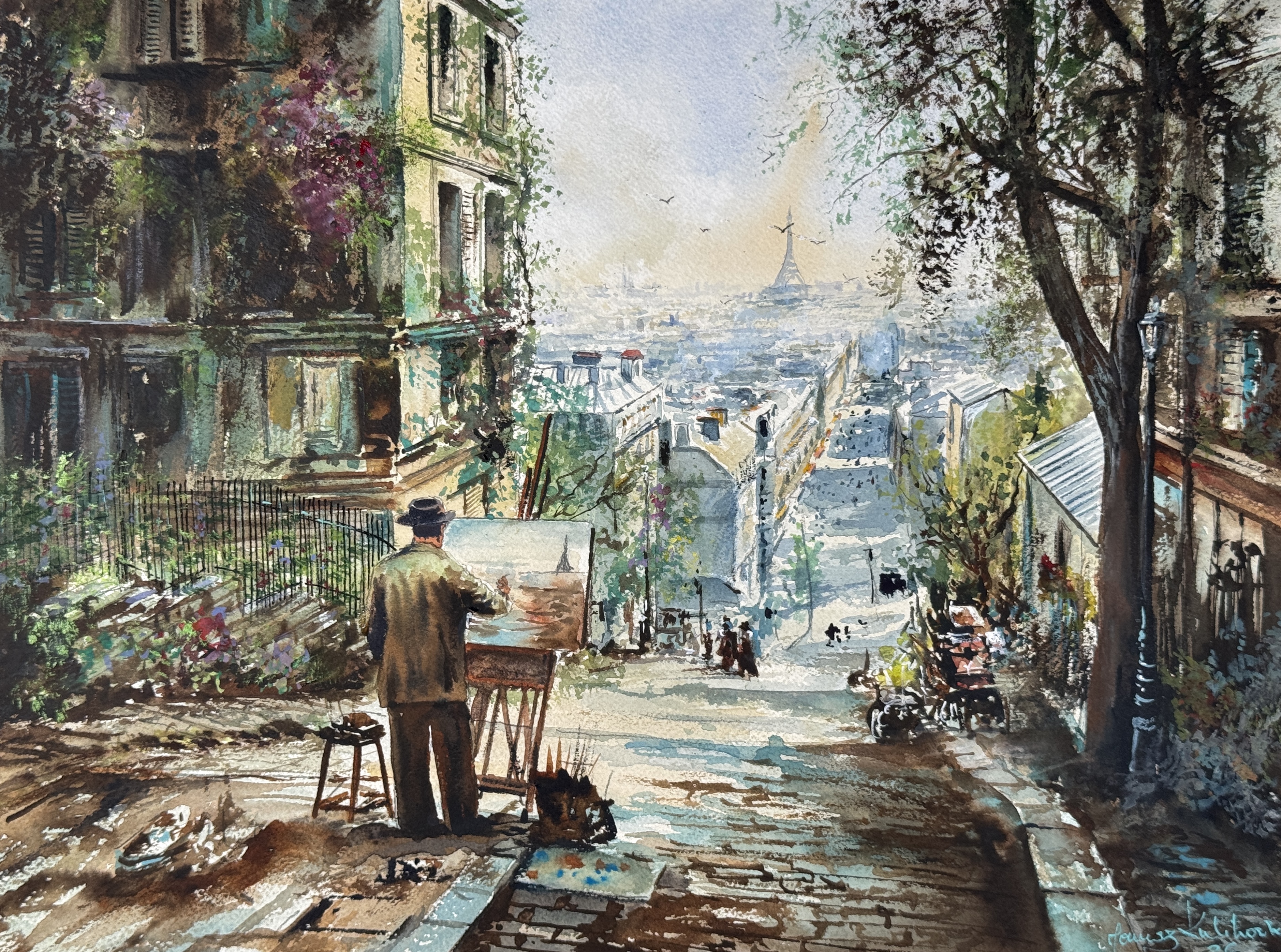 Na obrazie strome schody spływają ku miastu, w oddali majaczy wieża i mlecznobłękitny horyzont. Z lewej ściana kamienicy obrośnięta zielenią i fioletami, z prawej pień drzewa, a pośrodku kompozycję kotwiczy postać przy sztalugach. Na bruku plamy ochry i turkusu, rozrzucone pędzle, parę smużek jakby ręka lekko zadrżała. Atmosfera poranna, wilgotna, trochę nostalgiczna, ale i żywa, troszke romantyczna. Akwarela pracuje tu szeroko, laserunki rozlewają się miękko, miejscami pojawia się iluzja impastu. Czuję spokój i ukłucie tęsknoty, chciałoby się tu zgubić. Dla mnie to obraz o cierpliwym patrzeniu. Chciałbym iść po tych schodach i malować. Ten glow na niebie robi robotę.