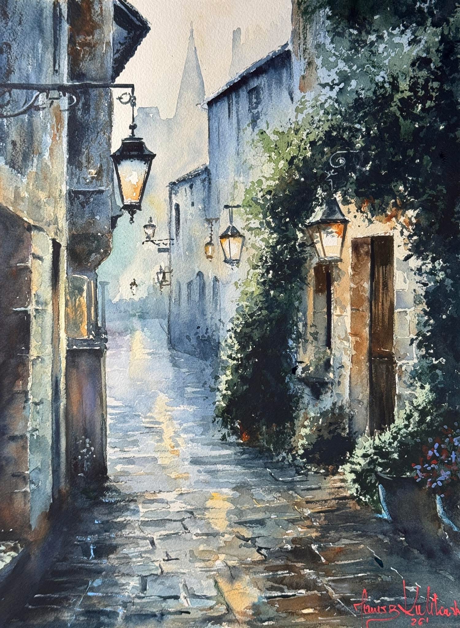 Obraz pokazuje wąską uliczke między starymi kamienicami. Dominują chłodne błękity i szarości murów. Przełamane ciepłymi plamami żółtego światła z latarni. Kompozycja prowadzi wzrok w głąb perspektywy. Po bruku z nierównych kamieni ciągną się mokre refleksy jak po deszczu. Po prawej ścianę oblepia gęsta zieleń. Miękka jak puch a miejscami rozbryzgana akwarelową plamą. To akwarela z widocznym ziarnem papieru. Z laserunkami i szybkimi pociągnięciami pędzla. Atmosfera jest cicha i trochę nostalgiczna. Jakby miasto dopiero budziło sie i nie chce gadac. Ja czuję spokój i lekkie ukłucie tęsknoty. To jest magic. Latarnie świecą jak oczy.