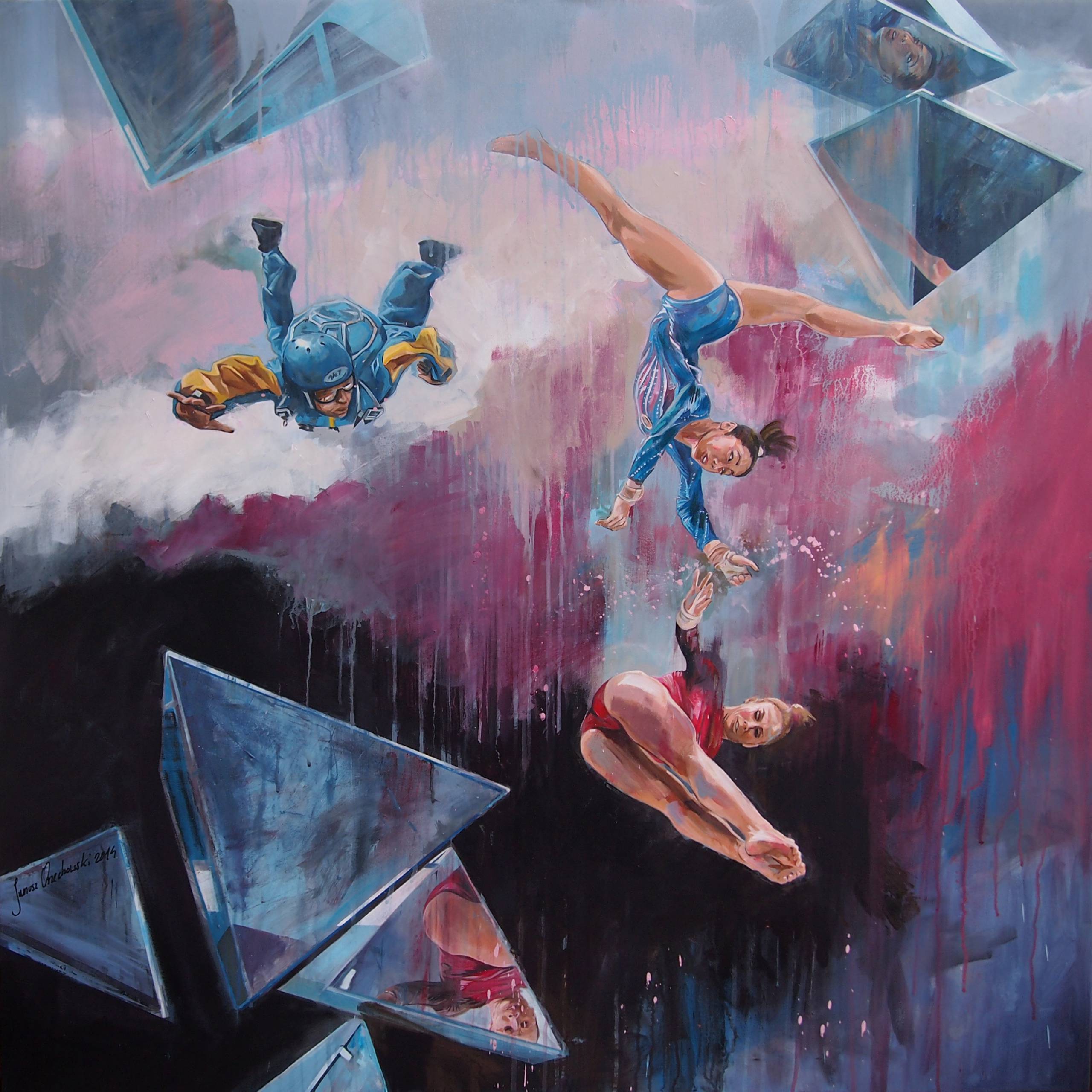 Obraz, który widzisz, jest prawdziwą bombą kolorów i emocji. Dominują na nim żywe odcienie niebieskiego i różu, które płynnie się przenikają, tworząc dynamiczny pejzaż. Na pierwszy plan wysuwają się postacie tancerzy i skoczka w powietrzu, ich ciało jest zwinne i pełne energii. W tle widoczne są kanciaste formy przypominające lustra, które wprowadzają do kompozycji element surrealizmu. Atmosfera jest napięta, pełna ruchu i niepewności, jakby cały świat wir ł w wirze. Artysta posłużył się stylem realistycznym z nutą abstrakcji – widać to po precyzyjnych detalach postaci i swobodnym rozlewie farb w tle. Technika zastosowana na obrazie to mieszanka oleju z akwarelą, co dodaje mu głębi i lekkości. Podziwiając dzieło, można poczuć, jakby samemu skakało się w dół w nieskończoność. Obraz budzi skojarzenia z wolnością, ale też lekkim szaleństwem. To uczucie, jakby krzyczeć w pustkę. "He looked up, then down. Whoop!" – myśli dziecko widzące tę scenę. To naprawdę coś, co zostaje z tym, kto na to patrzy. Wow, ten obraz to prawdziwy "eye-catcher". łączy w sobie ruch, emocje i pewną dozę magii. Widz ma ochotę zatracić się w nim, zgubić i znaleźć na nowo.