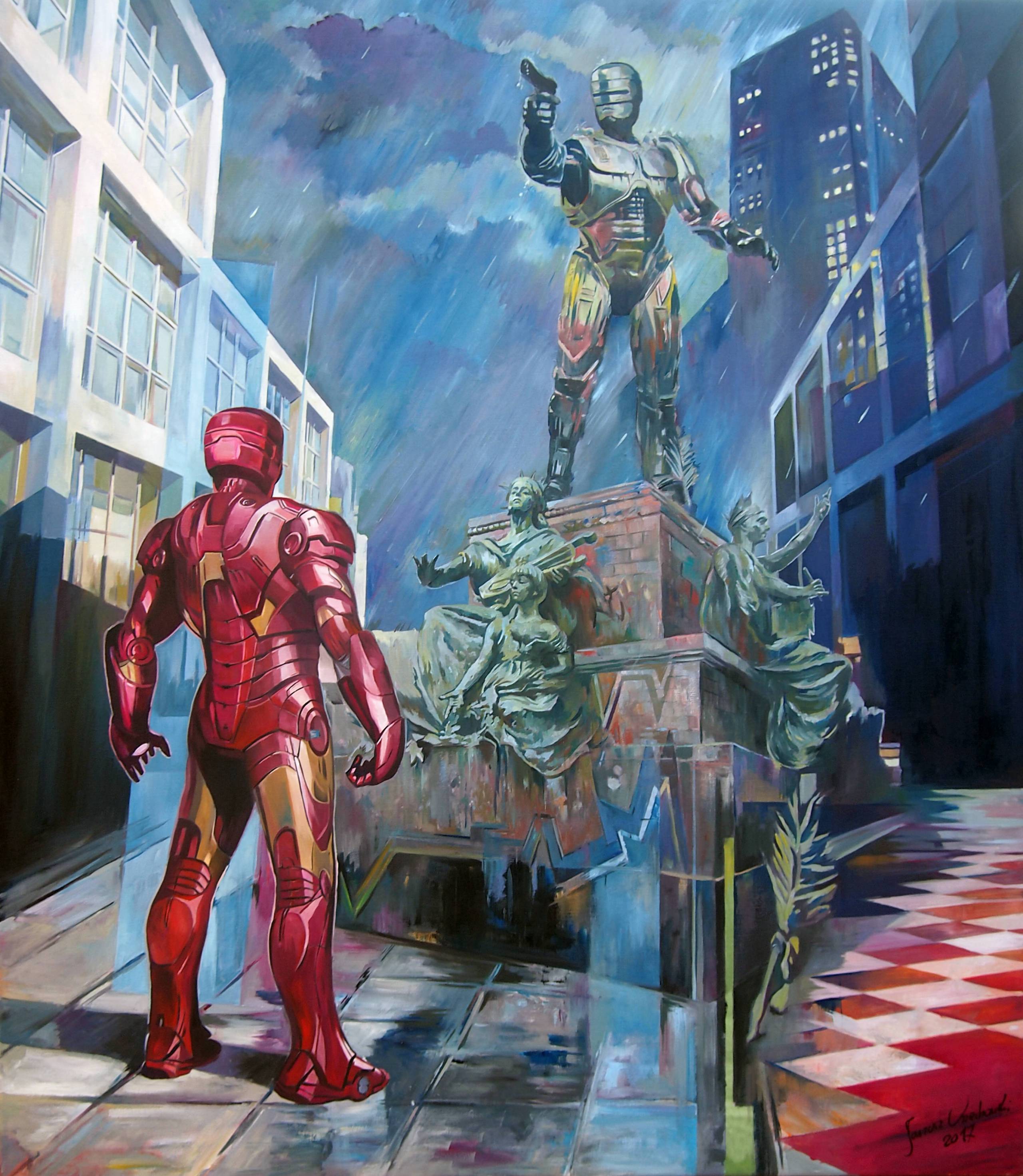 "When Iron man visits Detroit " obraz w stylu pop-art inspirowany filmem i komiksem.