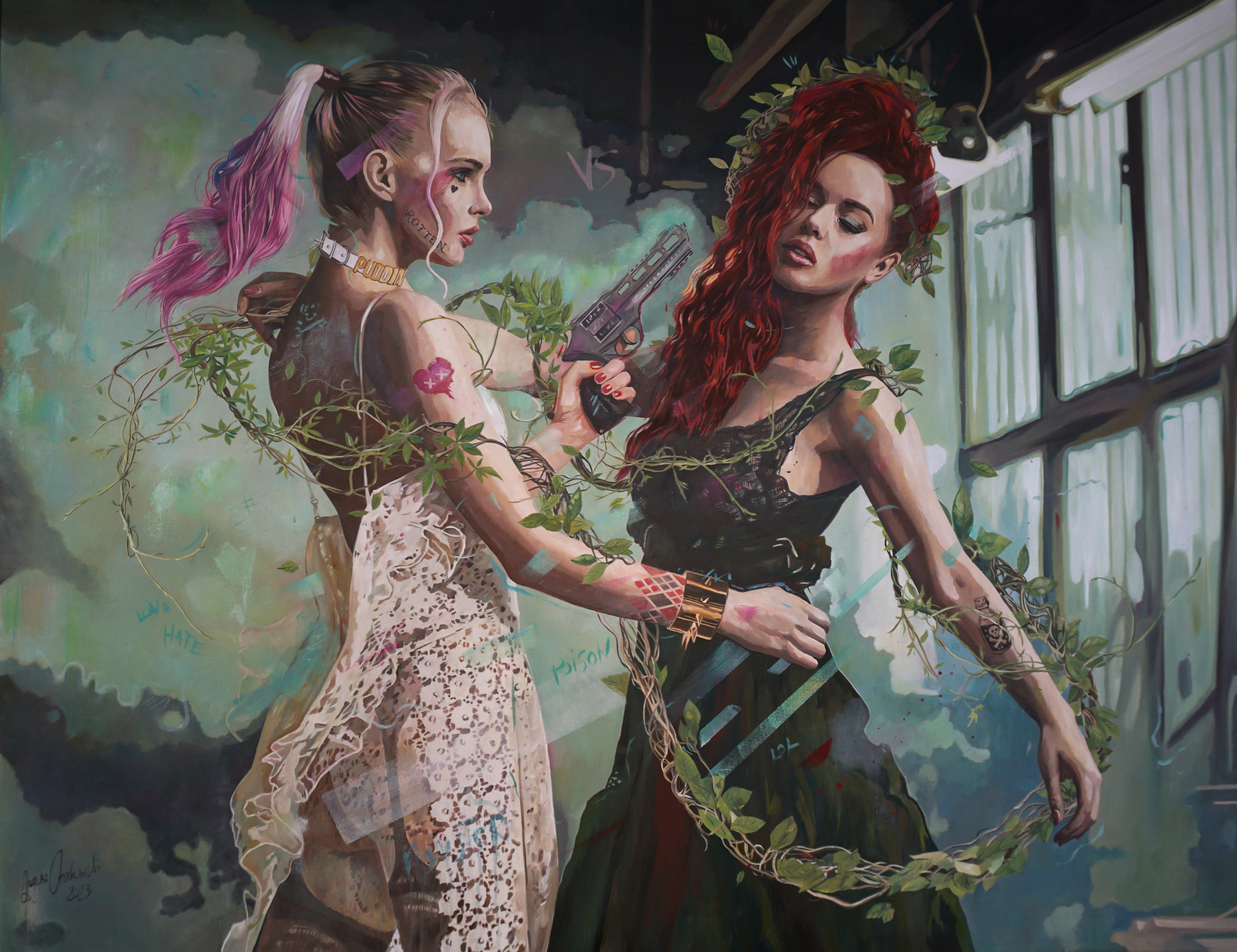 "Harley Quinn Vs Poison Ivy" mixed media oil on canvas 100x130cm 2023
