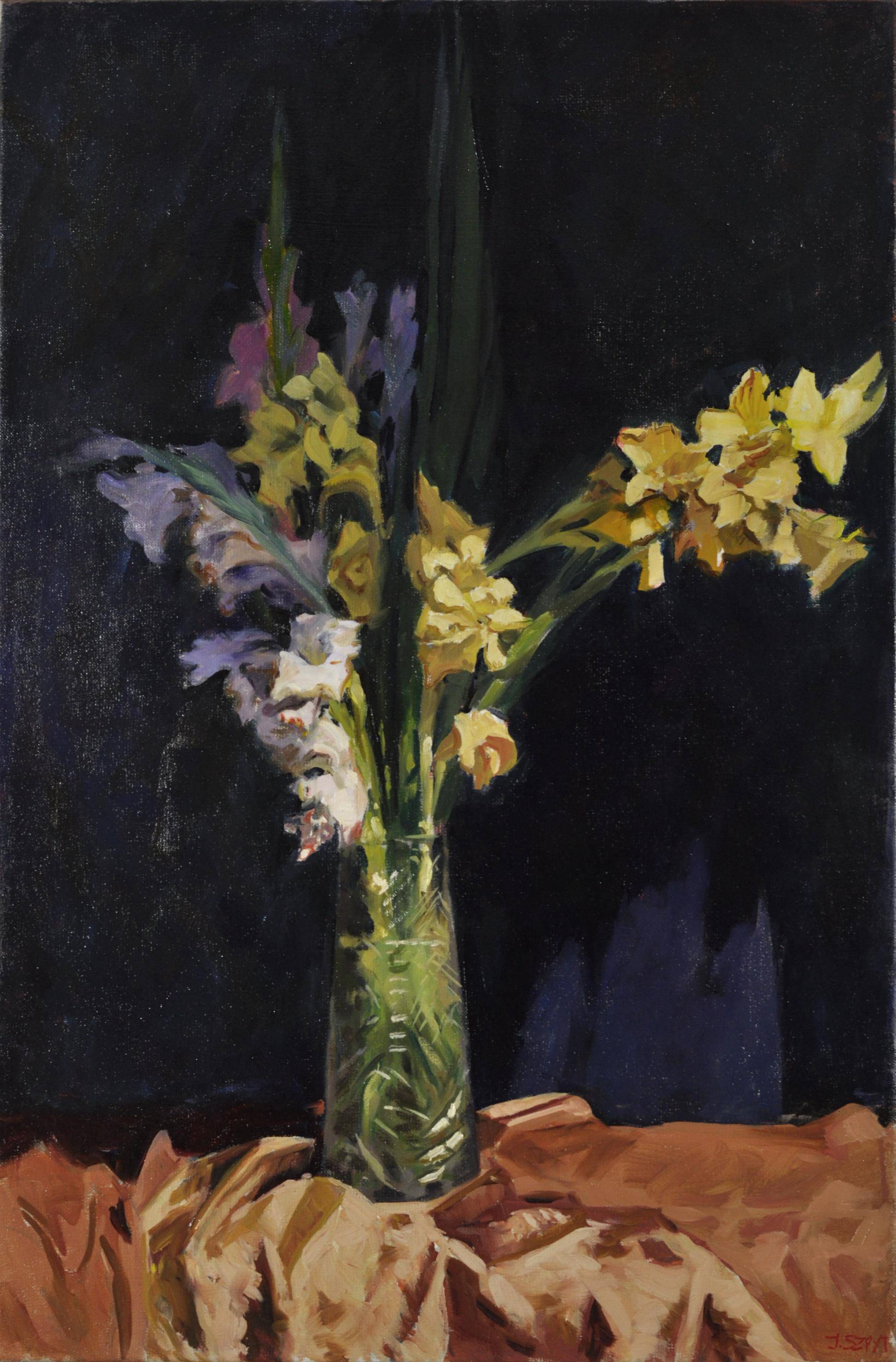 Na obrazie widzimy elegancki bukiet kwiatów na ciemnym tle, które perfekcyjnie podkreśla żywe barwy żółci i fioletu. Kwiaty delikatnie wylewają się z wazonu, tworząc dynamiczną kompozycję. Ich kształty są zróżnicowane, co dodaje im naturalnego uroku. Tkanina na dole zdaje się mieć teksturę miękkiego aksamitu, nadając całości luksusowy charakter. Atmosfera jest spokojna i introspektywna, jakby zatrzymana w czasie. Obraz promieniuje cichym urokiem codzienności, jednocześnie mając coś z sielanki. Styl malarza można opisać jako realistyczny, z wyraźnymi impresjonistycznymi wpływami w sposobie oddawania światła i cieni. Pędzel zdaje się tańczyć po płótnie, z wprawą uwydatniając każdy szczegół. Widz może poczuć ciszę letniego popołudnia, zanurzając się w najskrytsze zakamarki własnych myśli. Wow, ten kontrast wciąga! Przywodzi na myśl wspomnienia z dzieciństwa, kiedy świat zdawał się pełen cudów. Moja siostra też tak lubi malować. To jest prawdziwe magiczne, jak obraz może uchwycić coś tak nietrwałego i przekazać to z taką mocą. To jest "beauty" codziennych chwil, które artysta uchwycił z mistrzowską precyzją.