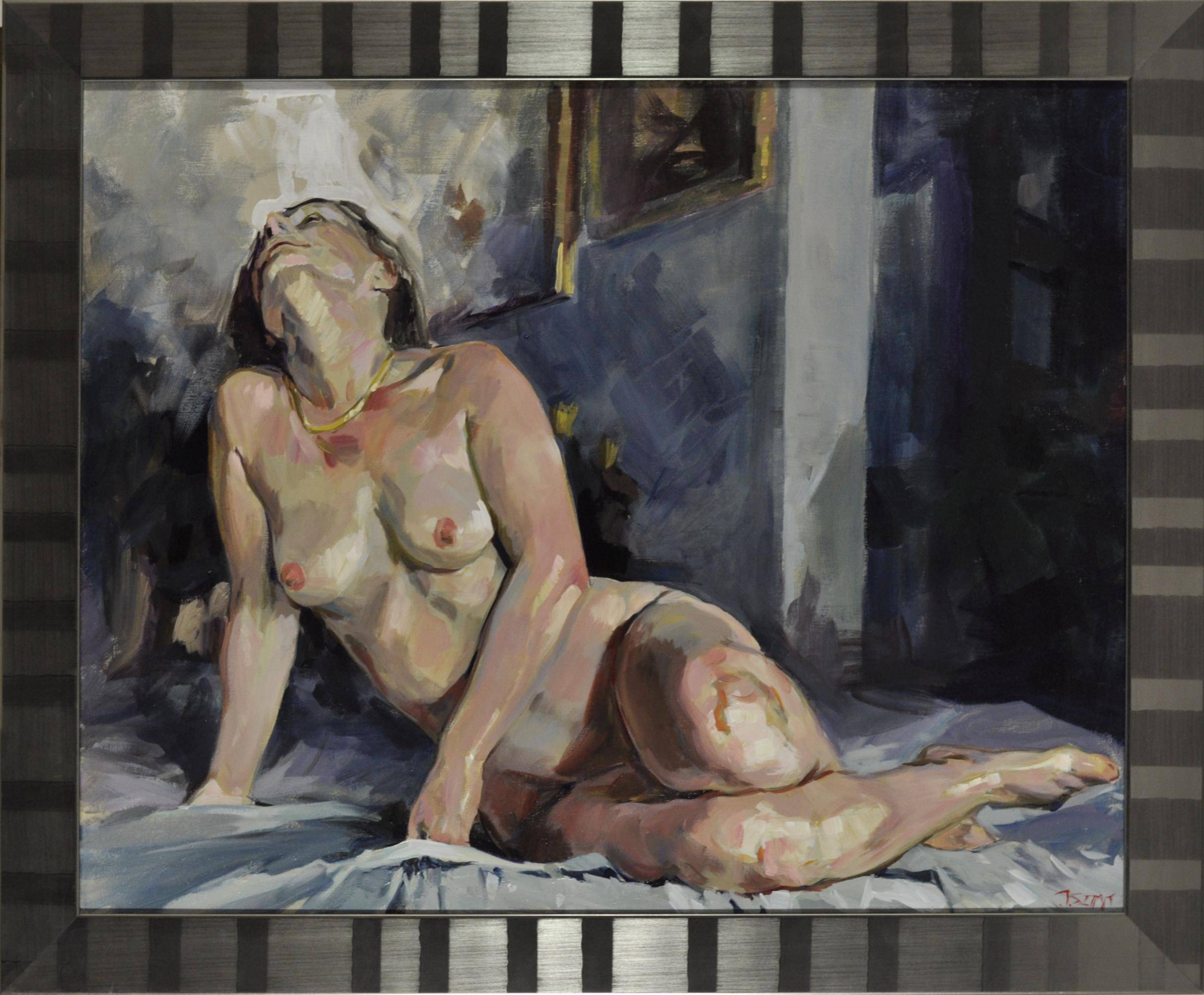 Na obrazie widzimy postać nagiej kobiety, która z gracją odpoczywa na miękkim podłożu. Jasne odcienie skóry kontrastują z ciemnym, tajemniczym tłem, na którym dominują różne odcienie niebieskiego i szarości, nadając kompozycji głębokość i trójwymiarowość. Kobieta ma odchyloną do tyłu głowę, co nadaje jej wygląd swobody i pewności siebie. Przyglądając się bliżej, można dostrzec subtelne, ale wyraźne pociągnięcia pędzla, które tworzą iluzję ruchu i światła, a technika przypomina impresjonizm, choć z nutą nowoczesności. Widać, że artysta nie bał się eksperymentować z teksturą i kolorem. Nastrój obrazu jest spokojny, może nieco melancholijny, a jednocześnie emanuje ciepłem. Klimat jest jak letni wieczór, gdy wszystko nagle staje się chwilą zatrzymaną w czasie. Odbiorca może odczuwać spokój, ale i pewnego rodzaju tęsknotę lub refleksję nad własną cielesnością czy przemijaniem. Jest coś w tej kompozycji, co budzi nostalgię za chwilą, która może nigdy się nie powtórzy. Taki obraz mówi do nas: "Take a moment". Zwraca uwagę na ulotność chwili, piękno prostych momentów życia. I jeszcze jedno: "Ona nie ma ubrań, mamo!". Może dziwnie, ale są tu emocje, które trudno opisać, tak jak trudno jest opisać zapach letniego deszczu. Ostatecznie, jest to dzieło, które może skłonić do zatrzymania się na chwilę, głębokiego oddechu i przemyślenia - co tak naprawdę jest ważne.