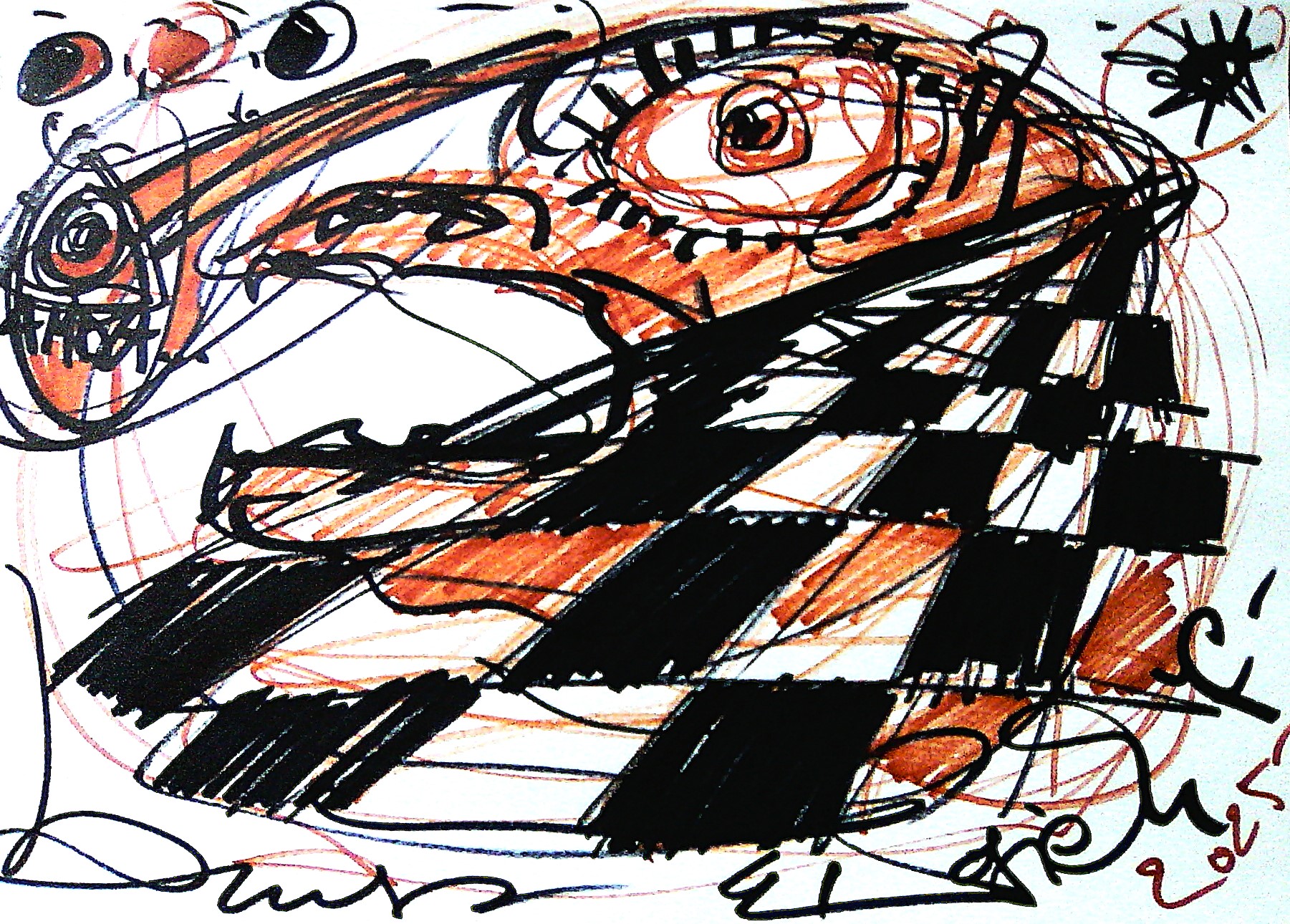 Obraz pełen energii i ekspresji od razu przykuwa wzrok gwałtownymi liniami i intensywnymi kolorami. Dominują odcienie czerni i oranżu, które ostrym kontrastem przecinają płaszczyznę kompozycji. Artysta postawił na dynamiczne zygzaki i krzywe, które przypominają wirujący taniec. Całość aż tętni ruchem. Atmosfera obrazu jest niczym rollercoaster emocji – wciąga widza w wir chaosu, ale jednocześnie frapuje i intryguje. Wygląda, jakby malarz chciał uchwycić chwilę pełną niepokoju i intensywności, coś jak "in the moment". Styl to czysty ekspresjonizm, pełen surowości i spontaniczności, co widać w nieskrępowanych pociągnięciach pędzla. Dla odbiorcy ten obraz może być niesamowicie porywający. Moja siostra powiedziała, że widzi w nim złość i radość jednocześnie. Użycie nieco chaotycznych linii i krzywizn dodaje dziełu głębokości, która porywa obserwatora w sposób niemal hipnotyczny. To dzieło to prawdziwy koktajl emocji, a każda wizyta wciąga w nie na nowo, odkrywając coś innego. Coś tak niesamowitego, że trudno oderwać od tego wzrok.