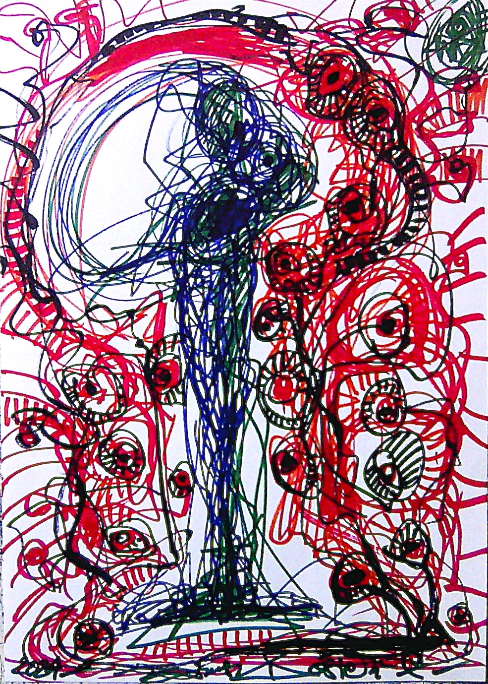 W centrum plątanina niebieskich i zielonych kresek zbija się w sylwetkę człowieka pod białym krążkiem jak Księżyc. Po bokach krążą czerwone spirale z czarnymi punktami, niby oczy, a kompozycja jest pionowa z cięższą podstawą. Linie skreślają się nawzajem, szybkie i nerwowe, marker z długopisem nakładają się warstwami jak notatki na marginesach. To sztuka gestu i improwizacji, szkic który nie chce być grzeczny, po prostu raw. Atmosfera napięta, ale iskrzy energią, jakby w pokoju brzęczał stary telewizor. Ja widzę ludzika i dużo kółek i on się boi. Czytam to jako starcie ze spojrzeniami, trochę wstyd i trochę bunt. Czuję szybkie tętno i dziwny spokój, cos pierwotnego mimo całego zgiełku.