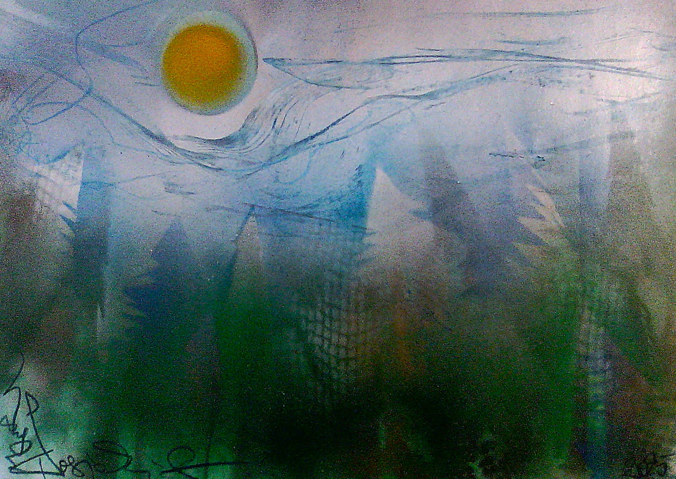Na płótnie rozlewa się chłodny gradient błękitów i szarości, z którego wyrasta mleczne słońce, kółko żółci z lekką zieloną poświatą. Poniżej płyną półprzezroczyste kształty, jak cienie drzew albo zarys miasta, krateczki i smugi podsuwają myśl o siatce i wietrze. Kompozycja swobodna, prowadzi wzrok po skosie i zostawia miejsce na oddech. Ma lekko postrzępione krawędzie. Nastrój jest cichy, hazy, odrobinkę melancholijny. Czuję aerozol, rozcieranie, szybkie pociągnięcia, potem celowe przetarcia i chrupkie ziarnko farby. Słońce wygląda jak żółte jajko. Patrzę i rozluźniam barki, tak po prostu. Ktoś zobaczy góry, ktoś wodę, ja ścieżkę w mgłę, bardzo bliską, prawie tuż. Ten obraz mówi, że cisza też potrafi krzyczeć.