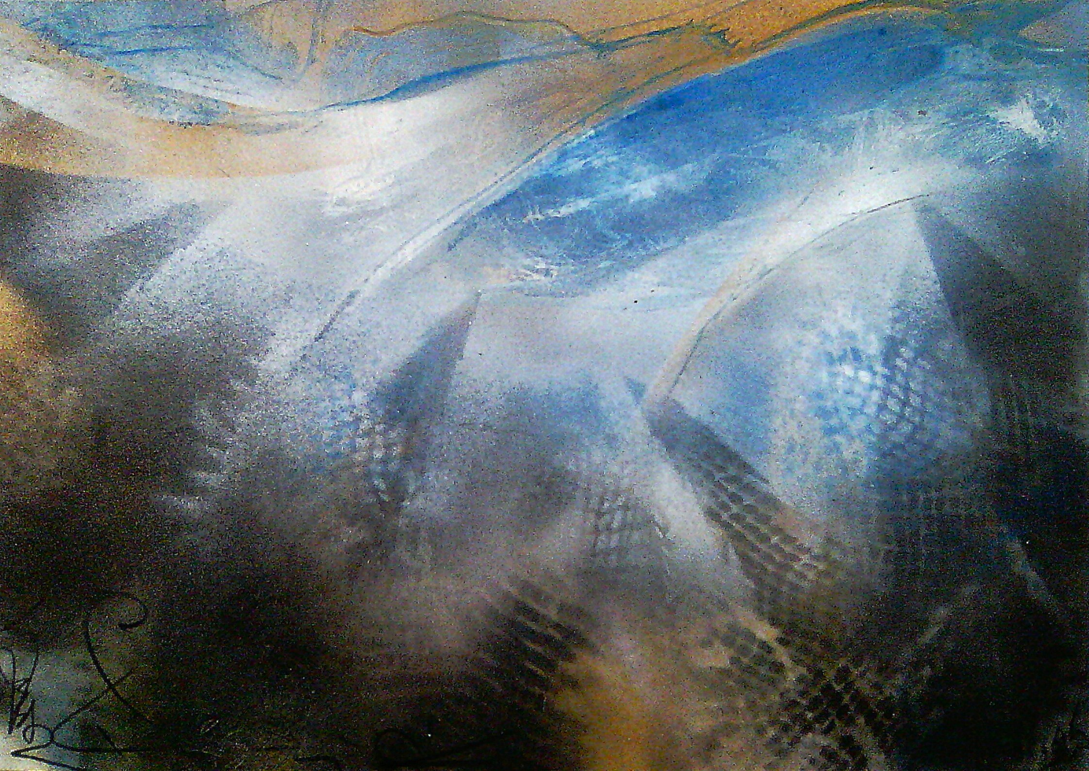 Na płótnie wirują zimne błękity i kredowe biele, przecinane szarą mgłą oraz ciepłą smugą ochry u góry. Kompozycja płynie ukośnie, jak wiatr pchający fale i łamiący kształty w trójkątne cienie, trochę jak dachy albo płetwy. To wygląda jak wielka fala i smok w chmurce. Atmosfera jest chłodna, hazy, ale nieprzyjemna nie jest. Czuję dystans i ciekawość. Artysta używa laserunków, przetarć, chyba też szablonów dających siatkowe wzory, jak od opony czy rybiej łuski. Nie ma tu krzyku barw, jest szept i drobny szum. Obraz wywołuje skojarzenie z burzą piaskową nad morzem. Naprawdę mnie to wciąga, choć trochę gubię się w tej mgle i to mi się podoba. Taki miszmasz, ale kontrolowany. Czuję spokój po przejściu sztormu.