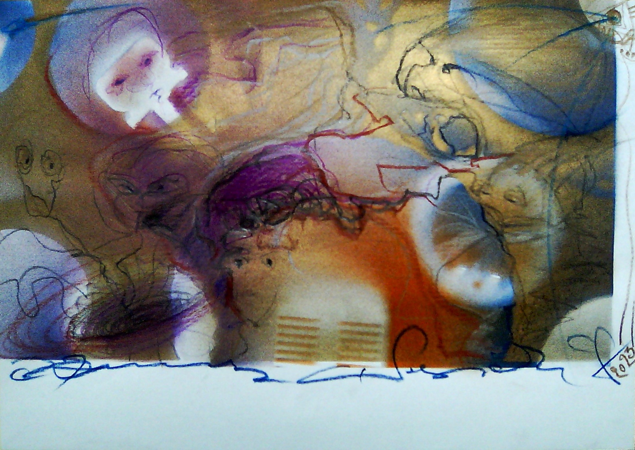 Na tym obrazie widzimy eksplozję kolorów i emocji. Barwy mieszają się swobodnie, dominują odcienie fioletu, pomarańczu i błękitu. Kompozycja jest dynamiczna, jakby artysta chciał uchwycić chwilę ruchu. Kształty są rozmyte, przypominają chmury myśli lub wspomnień unoszące się w powietrzu. Atmosfera obrazu jest trochę tajemnicza, trochę magiczna. To jak sen, który pamiętamy tylko częściowo. Styl artystyczny to prawdziwy mix – jest tu coś z abstrakcji, a może nawet surrealizmu. Technika malarska wydaje się swobodna, a jednocześnie precyzyjna w swojej niedoskonałości. Przyciąga wzrok i zmusza nas do refleksji. Emocje, jakie wywołuje ten obraz, to przede wszystkim ciekawość i nostalgia. Czy te zarysy to twarze? A może tylko zarys wspomnień? Ah, imaagine possibilities! Patrząc na ten obraz, myślę sobie: „Ciekawe, co autor miał na myśli”. Moje serce bije szybciej, jakbym odkrywał tajemnicę. Obraz jest intrygujący i każdemu z nas może opowiedzieć inną historię. Każda linia, każdy kolor wydaje się mówić: „Poszukaj głębiej”. To prawdziwa artystyczna podróż dla wyobraźni.