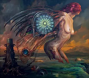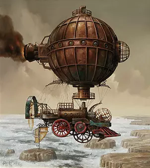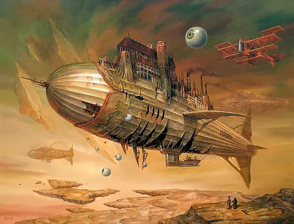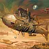 Obraz przedstawia surrealistyczną scenę, w której monumentalny statek powietrzny przypomina starodawną katedrę, unoszącą się w przestworzach. Barwy są ciepłe i ziemiste, dominują odcienie złota, brązu i ochry. Wszystko to daje wrażenie być trochę jak z sennego marzenia, a nie z rzeczywistości. W tle widzimy tajemnicze formacje skalne i wiszące w przestrzeni wyspy, co dodatkowo potęguje poczucie surrealizmu. Ten floating skyship zmierza w stronę nieznanego. Całość kompozycji jest dynamiczna, mimo że brak tu chaotyczności — rządzi się ona swoimi prawami. Technika, jaką posłużył się artysta, przypomina nieco renesansowe malarstwo, z dbałością o detale i światłocień. Atmosfera obrazu jest tajemnicza i nieco melancholijnaa. Wywołuje pewien rodzaj zadumy nad ludzkimi marzeniami i odkrywaniem nieznanych światów. Można sobie wyobrazić, że dziecko mogłoby powiedzieć: "To są ogromne latające domy, które lecą do nieba!" Ten obraz może wywołać w odbiorcy emocje związane z nostalgią za utraconymi czasami i dziecięcymi fantazjami. Osobiście, patrząc na to dzieło, czuję ekscytację i fascynację — jakbym na chwilę mógł przenieść się do innego świata, pełnego magii i niezwykłych przygód. Każdy szczegół, każda linia prowadzi ku głębszej refleksji nad naszym miejscem w świecie pełnym tajemnic.