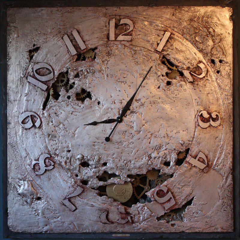 Obraz przedstawia zegar o wyjątkowo starodawnym wyglądzie, jakby wydobyty z innego czasu. Dominują na nim odcienie szarości zmieszane z brązami i subtelnymi przebłyskami złota. Cyfry są duże i nieco nierówno rozmieszczone, co dodaje całości rustykalnego, niemal postapokaliptycznego charakteru. Warto zauważyć, jak powierzchnia jest pokryta licznymi wgłębieniami i przebarwieniami, a zębatki widoczne w tle każą myśleć o skomplikowanej mechanice czasu. Klimat obrazu jest ciężki i nostalgiczny. Artysta użył tu techniki, która przypomina mieszankę reliefu z kolażem. Zastosował grube warstwy farby i wtopił w nie różne materiały, co daje efekt trójwymiarowości i nieco przytłaczającego ciężaru. Otaczająca go aura wydaje się pełna refleksji nad upływem czasu. Patrząc na dzieło, widz może poczuć niepokój, lecz także pewnego rodzaju fascynację tym, jak czas kształtuje materię. Wow, zegar wygląda jak z bajki o piratach! Właśnie takie emocje mogą wywoływać w gamie odbiorców. To obraz, który przyciąga uwagę i zmusza do zadumy. Zastanawiasz się, jaką historię opowiadają te zniszczone liczby i pordzewiałe zębatki. W całej swojej unworn subtelności, dzieło pokazuje, że piękno można znaleźć nawet w upadku i zniszczeniu. Każdy szczegół zachęca do bliższego przyjrzenia się i refleksji nad kruchością czasu.