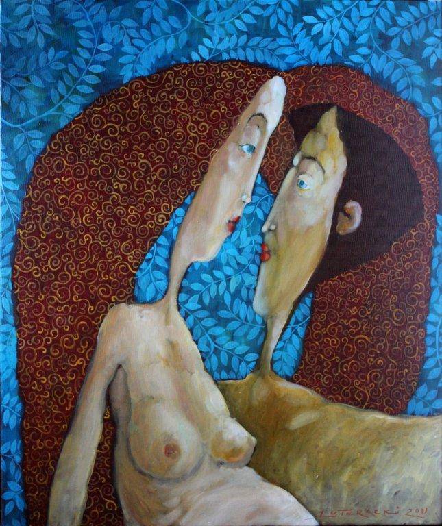 Obraz ukazuje dwie postacie przyciągnięte ku sobie w intymnym kontakcie. Kolory są intensywne, z przewagą błękitnego tła naznaczonego wzorami liści. Postacie mają wydłużone, zniekształcone kształty, co nadaje im niemal surrealistyczny charakter. Cała kompozycja obraca się wokół kontrastu ciepłych barw skór oraz chłodnych, dekoracyjnych wzorów w tle. Atmosfera jest tajemnicza i niemal hipnotyzująca. Czuć w niej coś onirycznego, jak w marzeniu sennym. Styl artysty łączy elementy kubizmu z dekoracyjnym przepychem, widać tu wpływy sztuki secesyjnej. Technika olejna pozwala na uzyskanie bogatej faktury i głębi kolorów. Patrząc na ten obraz, można poczuć pewien niepokój i jednocześnie fascynację. Czy to miłość? Czy spotkanie dusz? Możliwości interpretacji są endless. Malunki tych par przypominają bajkę, w której wszystko jest możliwe. Chciałbym tam być z nimi i poczuć tę dziwną magię. Obraz może wzbudzać w odbiorcy uczucie nostalgii za utraconym ideałem lub za tajemniczym, utopijnym światem. Wywołuje skojarzenia z snem, gdzie nie wszystko jest takie, jak się wydaje, a może i nawet z odrobiną humoru. Co by powiedziało dziecko, widząc takie arcydzieło? Może tak: te Panie się bardzo lubią! Te emocje i te kolory – to uczta dla zmysłów, prawdziwa oda do miłości i piękna.