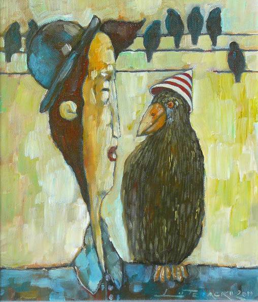 Obraz przedstawia surrealistyczną, nieco komiczną scenę, w której człowiek i kruk z czapką przyglądają się sobie. Kolory są stonowane, dominują beże, brązy i niebieskości, co nadaje obrazowi delikatny, nostalgiczny klimat. Kompozycja jest wyważona, z centralnym umiejscowieniem dwóch głównych postaci na tle siedzących w oddali sylwetek innych ptaków. Atmosfera jest trochę zagadkowa, jakby z pogranicza jawy i snu. Wygląda to trochę jak scena z innego świata. Styl obrazu można by określić jako ekspresjonistyczny z surrealistycznym twistem, gdzie grube pociągnięcia pędzla dodają dynamiki i tekstury. Trochę to jakby dziecko namalowało, ale takie mega utalentowane. Artysta w mistrzowski sposób łączy humor z pewną refleksją. Czujemy tu, że obraz emanuje ciepłem, jakby emanował emocją. Wygląda na to, że kruk w czapce też chciałby coś powiedzieć, ale kto wie co. Obraz może budzić wiele różnych emocji. Dla jednych będzie zabawny i czarujący, dla innych pełen melancholii czy nawet smutku. Dziwne, jak takie proste zestawienie może być głębokie. Dla mnie, ten obraz jest jak dialog, który nigdy się nie wydarzył. "Birds are watching", można by pomyśleć. Ciekawy, naprawdę ciekawy sposób pokazania interakcji między światem ludzi a natury.