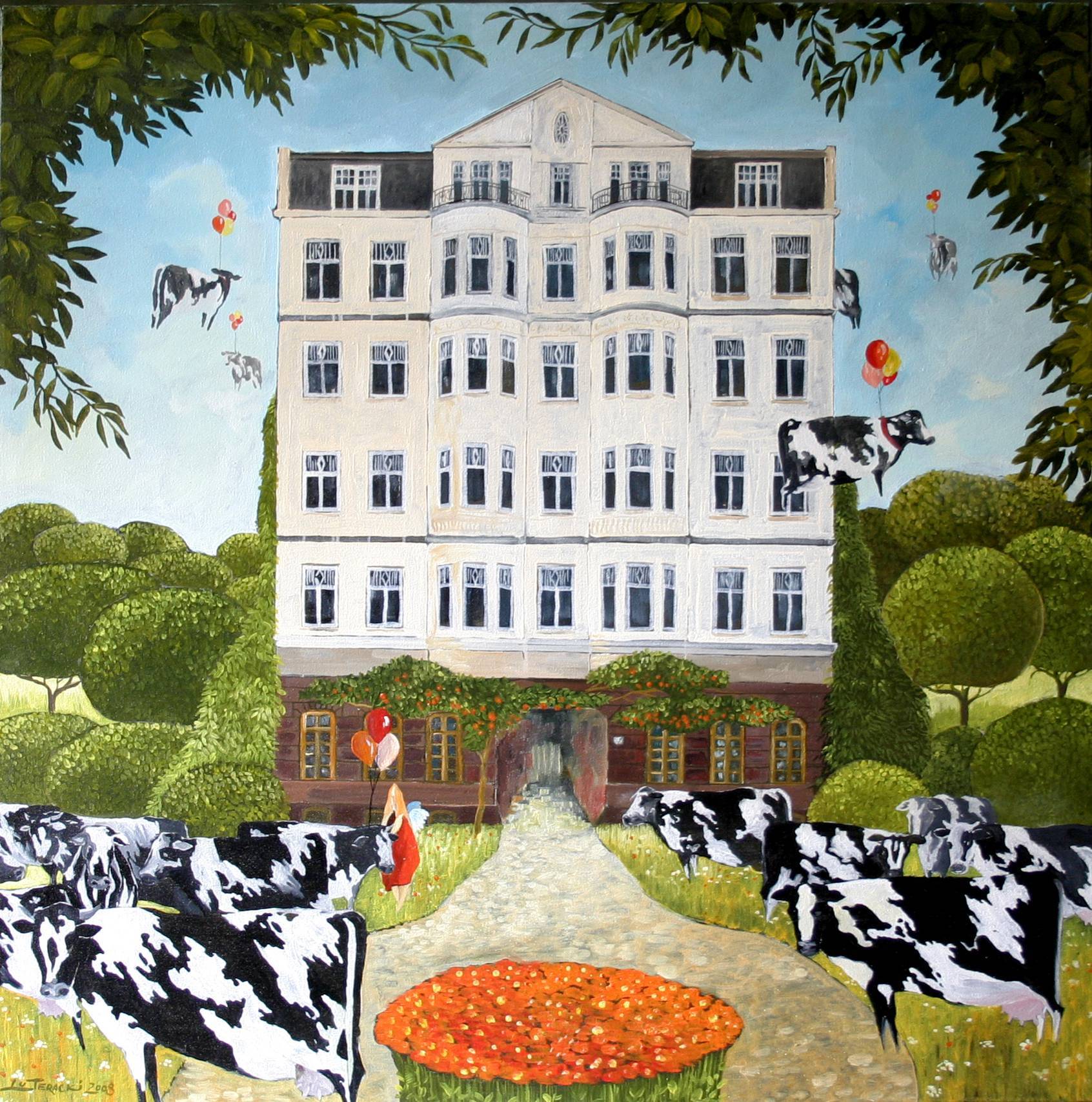 Obraz przedstawia surrealistyczną scenę z uroczym kontrastem między elementami naturalnymi a urbanistycznymi. W centrum widzimy wysoką, białą kamienicę z mnóstwem okien, otoczoną soczystą zielenią drzew i traw. Już samo to, że krowy unoszą się w powietrzu dzięki balonikom, sprawia, że widz się uśmiecha. Niebo jest blue, a jasne kolory dominują, nadając całości pogodny, idylliczny nastrój. U podstawy kompozycji widoczne są krowy, spokojnie przechadzające się po zielonej łące, a jedna z nich, trzymająca czerwony balonik, wydaje się być gotowa do podjęcia podniebnej podróży. Hmm, ciekawe co by się stało, gdyby naprawdę poleciały. Można odnieść wrażenie, iż czas na moment się zatrzymał, a jedynie delikatny wietrzyk porusza elementy obrazu. Artysta wykorzystał płynne pociągnięcia pędzla i wyraziste kontury, co daje efekt nieco oniryczny, ale jednocześnie bardzo konkretny. No i ten kwiatowy klomb na dole, pełen czerwonych kwiatów, który przyciąga wzrok jak magnes. Obraz może budzić wiele emocji, od śmiechu po zadumę nad dziwacznością codziennych sytuacji. Jest w tym jakaś lekkość, ale i głęboka refleksja nad granicami naszej wyobraźni – czy wszystko musi być takie oczywiste. To trochę jak patrzenie na świat oczami dziecka, które dostrzega magię tam, gdzie inni widzą zwyczajne rzeczy.