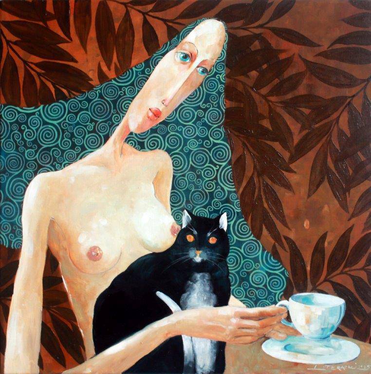 Obraz przedstawia intrygującą postać kobiety z wydłużoną twarzą i długimi włosami, przytulającą czarnego kota. Tło ozdobione jest spiralnymi wzorami w odcieniach turkusu, co dodaje hipnotyzującego efektu. Liście w tle są brązowe, co kontrastuje z jasną skórą kobiety. Z boku widzimy filiżankę, uzupełniającą kompozycję. Wszystko razem daje wrażenie surrealizmu, mieszanki snu i rzeczywistości. Patrząc na to dzieło, czujemy się, jakbyśmy zanurzyli się w intymnej chwili spokoju i zadumy. Kobieta z kotem emanuje spokojem i tajemniczością, jakby dzieliła z nami tajemnicę swojego świata. Styl malarski jest lekko kubistyczny, z zaakcentowanymi liniami i płaskimi kolorami, co nadaje obrazowi nowoczesny sznyt. Może to być emocjonalne doświadczenie – obraz wzbudza ciekawość, a jednocześnie wprowadza nas w stan „zen”. Może dziecko powiedziałoby: „Kobieta ma kota i piją herbatę”. Wow, jaka fajna scena! Ciekawe, czy ten kot ma imię. Te spiralne wzory przypominają mi burzę myśli, która jednocześnie jest piękna i chaotyczna. Ten obraz to mieszanka elegance i tajemnicy.