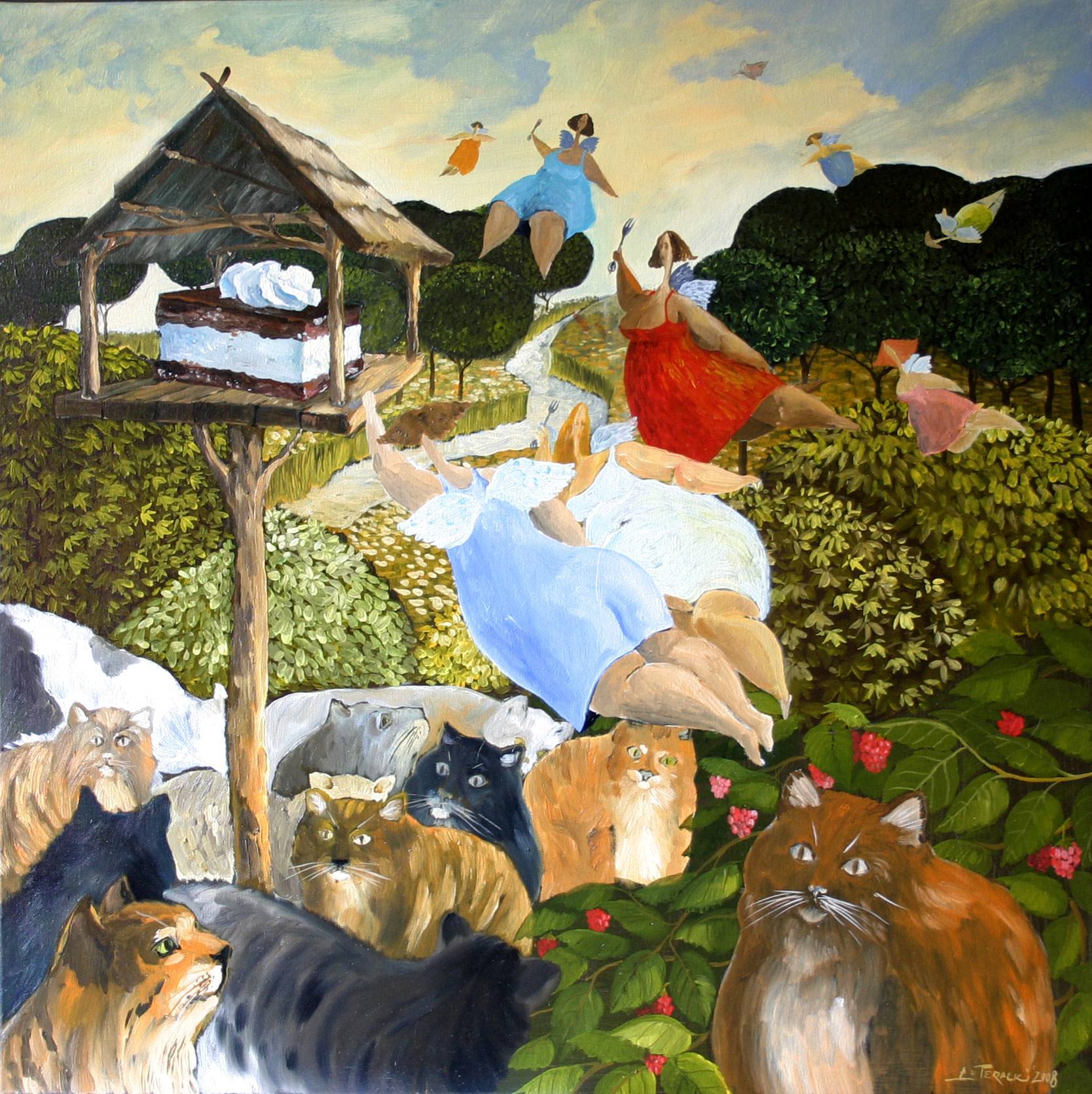 Ten obraz to prawdziwa feeria barw i kształtów. Dominują tu ciepłe odcienie zieleni, brązu i błękitu, które łączą się w bajkową kompozycję. W centrum widzimy grupkę pulchnych postaci frunących wśród nieba, które przyciągają wzrok swoimi kolorowymi sukienkami. Wokół nich, na ziemi, zebrane są koty o przeróżnych umaszczeniach, patrzące z zaciekawieniem, jakby były świadkami magicznego spektaklu. Ich oczy porozumiewawczo błyszczą w świetle dnia. Atmosfera jest jednocześnie lekka, zabawna i trochę surrealistyczna. Obraz emanuje spokojem, a może nawet cichym zachwytem nad światem. Artysta z pewnością sięgnął po elementy realizmu magicznego, co podkreślają płynne linie i miękkie przejścia kolorystyczne. Ta kombinacja stylu i tematyki tworzy intrygujący "dreamlike" nastrój. Dzieło może budzić w oglądającym wiele emocji, od rozbawienia po głęboką refleksję o dziecięcej marzycielskiej naturze. Te latające panie przypominają, że każdy ma w sobie coś z dziecka. Mój błąd ortograficzny? Hmm, może być ich więcej, ale to z nadzieją, że oddam margines autentyczności. Ja, patrząc na ten obraz, czuję się, jakbym wrócił do letnich dni spędzonych bez trosk na łonie natury. "Kotki są fajne!" powiedziało by dziecko pewnie. Lekka niedoskonałość nakłada się na doskonałe uchwycenie chwili, co sprawia, że obraz jest nie tylko piękny, ale i bardzo, bardzo żywy.