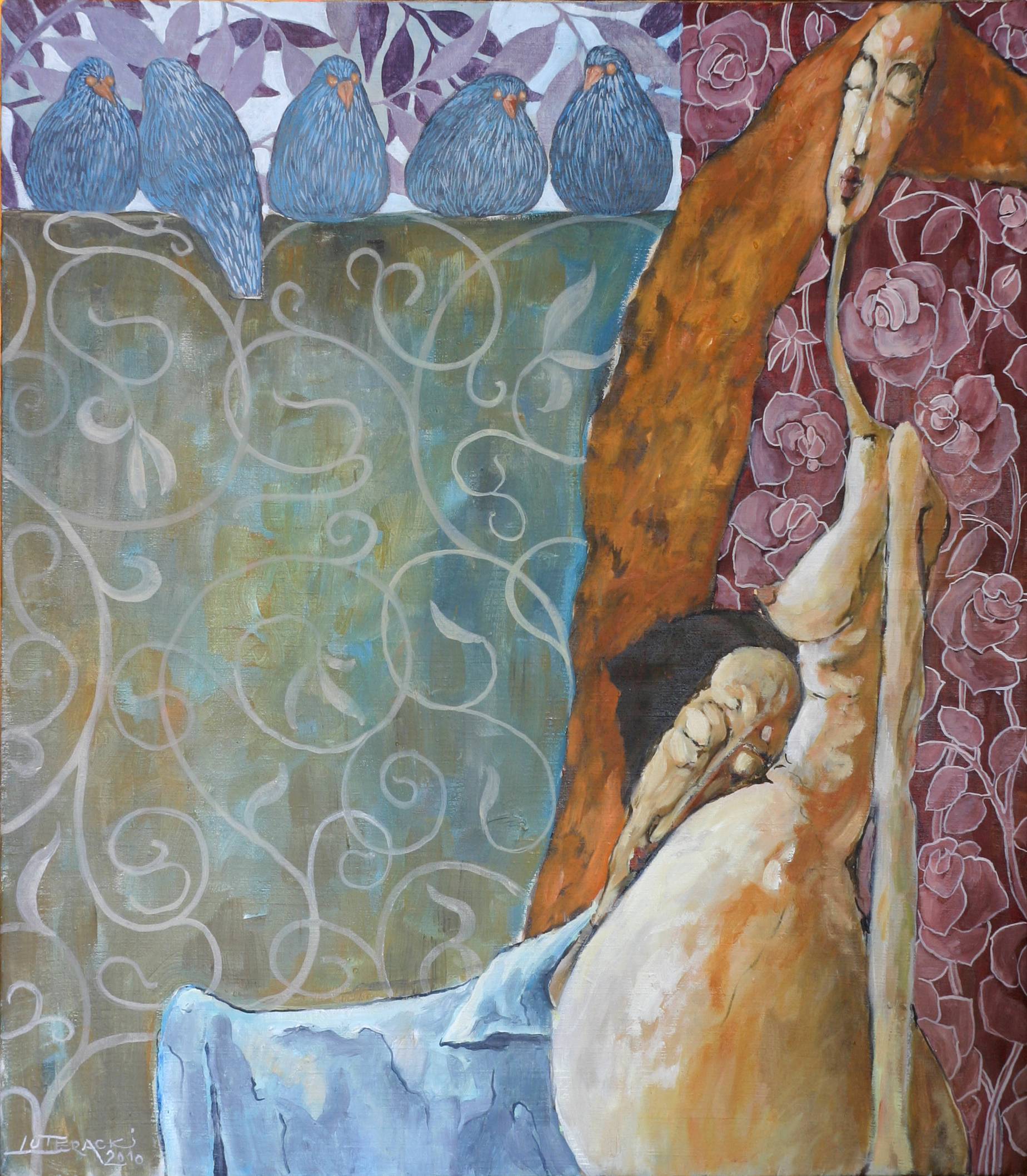 Obraz emanuje tajemniczym wdziękiem, łącząc w sobie bogactwo kolorów i kształtów. Po lewej stronie widzimy pięć niebieskich ptaków z pomarańczowymi dziobami, które siedzą na tle delikatnych, wijących się liści. Ich równe odstępy tworzą harmoniczną kompozycję. Przeważające chłodne, zielonkawe i fioletowe tonacje nadają tej części obrazu poczucie spokoju. Z drugiej strony, intensywne czerwone róże tła kontrastują z postacią o wydłużonych, subtelnych liniach. Postać odchylona do tyłu, wygląda jakby unosiła się w zadumie. Atmosfera obrazu jest jak mżawka ciepłego dnia – delikatna, ale pełna emocji. Styl obrazu można określić jako mieszankę surrealizmu z elementami abstrakcji. Detale takie jak ptasie pióra czy twarze postaci są wyraziste, ale jednocześnie mają w sobie nutkę „dreamy” tajemniczości. Te różnorodne techniki, głównie akrylowe, wprowadzają widza w stan kontemplacji. Jedno spojrzenie wystarczy, by poczuć tę delikatną mieszankę spokoju i niepokoju, jakby czas stanął w miejscu na moment, dokładnie ten. Dla mnie ten obraz to podróż w głąb siebie. Jak na niego patrzę, czuję lekkie mrowienie. Może to dziwne, ale tak jest. Myślę, że artysta wodospadzie emocji, wprowadza nas w refleksję nad równowagą i dualizmem świata. To dzieło sztuki skłania do zastanowienia się nad naszymi emocjonalnymi więzami i często kruchą, lecz piękną równowagą życia. Ciekawe, co na ten temat powie siedmiolatka – „Ptaki siedzą i chyba lubią ten obrazek”. W końcu sztuka to właśnie to – emocje, które każdy odczuwa na własny sposób.