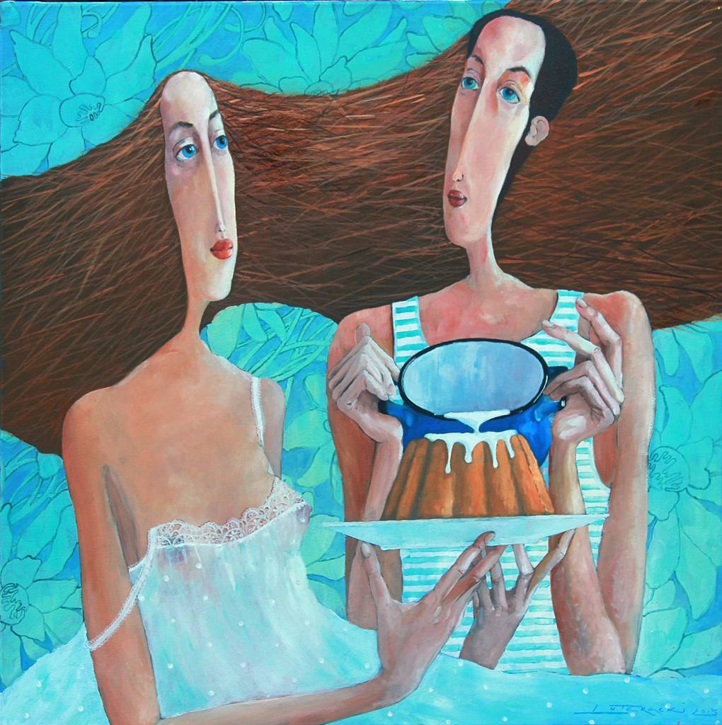 Na obrazie dominują spokojne, pastelowe kolory, z przewagą błękitu, który przypomina letnie niebo. Postacie są wydłużone, niemal surrealistyczne, co nadaje całej kompozycji odrealniony charakter. W tle widzimy motywy kwiatowe, delikatnie zarysowane, które dodają obrazowi lekkości. Nastrój dzieła jest senny i marzycielski; czujemy się, jakbyśmy zaglądali do świata snów, gdzie wszystko jest możliwe. Artysta zastosował technikę olejną, z widocznymi pociągnięciami pędzla, które dodają dynamiki i energii. Kontrast między wyrazistymi liniami postaci a łagodnym tłem tworzy ciekawą harmonię. No i te spojrzenia postaci – wydają się kryć jakąś tajemnicę, jakby chciały coś powiedzieć, ale milczą. Obraz może budzić różnorodne emocje. Dla jednych będzie nostalgiczny, dla innych wręcz surrealnie radosny. Jak napisałoby 7-letnie dziecko: "Te panie wyglądają jak z bajki!". Ciekawość i pewien niepokój przeplatają się ze sobą, pozostawiając nas z uczuciem zadumy. Takie "dreamy" dzieło z pewnością zachęca do dłuższego spojrzenia i refleksji nad codziennością, zamkniętą w tej niezwykłej scenie.
