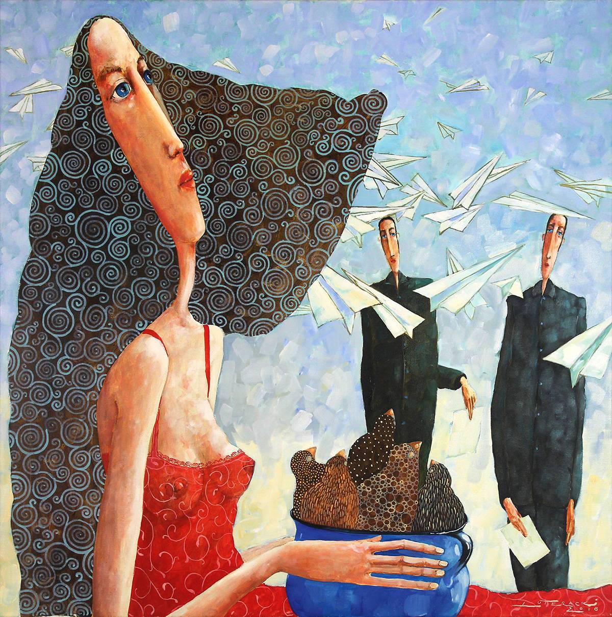 Obraz przedstawia niezwykle intrygującą kobietę w czerwonej sukni. Jej twarz, podłużna i o wyrazistych, niebieskich oczach, jest jednocześnie zagadkowa i piękna. Jej włosy wirują z niezwykłą finezją, jakby wiatr bawił się ich fakturą pełną zakręconych linii. Tło obrazu wypełniają latające papierowe samoloty, które wprowadzają element dynamiki i ruchu. Kolorystyka harmonijnie łączy ciepłe i chłodne odcienie, co tworzy ciekawy kontrast. To dzieło takie surreal. Coś jak sen. Mężczyźni w ciemnych garniturach stoją z tyłu, niczym postacie z innego świata, obserwując uważnie. Atmosfera obrazu jest oniryczna, pełna dziwnego spokoju, a zarazem niewytłumaczalnego napięcia. Można niemal usłyszeć szum papierowych samolotów przecinających powietrze. Technika malarska łączy impresjonistyczne plamy barw z ekspresjonistycznym przerysowaniem postaci, co nadaje całości nowoczesnego charakteru. To prawie jak w bajce, gdzie wszystko jest możliwe. Obraz może wywoływać u odbiorcy mieszane uczucia: od zachwytu po niepokój. Zastanawiam się, co artysta chciał przez to powiedzieć. Czy to opowieść o marzeniach? A może o samotności w tłumie? Dla mnie to przypomnienie, że rzeczywistość i wyobraźnia mogą się przenikać. Ten obraz pozostawia wiele do myślenia i to jest w tym najpiękniesze. Zadziwia i zmusza do refleksji.