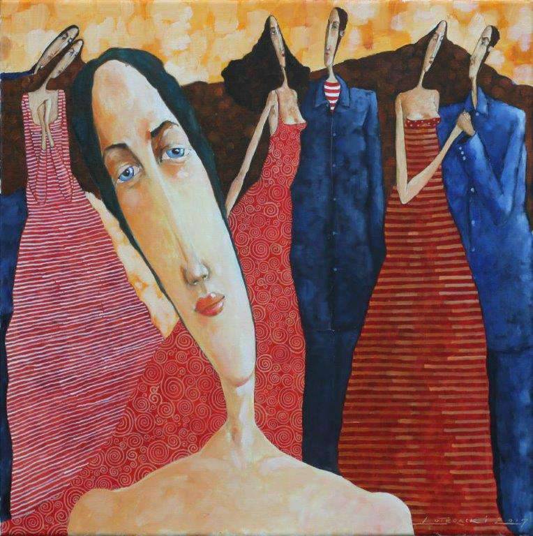 Obraz, pełen żywych kolorów i długich kształtów, przyciąga wzrok swoją nietypową kompozycją. Dominują tu odcienie czerwieni i błękitu, a każda z postaci ma wydłużone, stylizowane twarze. Tło jest w ciepłych barwach, co dodaje całemu dziełu surrealistycznego klimatu, przypominającego sny z krainy fantazji. Obraz wygląda trochę jak z bajki, gdzie wszystko jest troszkę inne, ale jakby znajome. Atmosfera rozbrzmiewa nostalgią i pewną tajemnicą. Czy ci ludzie są zamyśleni, czy raczej rozbawieni? Trudno powiedzieć, lecz czuje się głębię ich spojrzeń. Artysta zastosował tu styl bliski ekspresjonizmowi, gdzie forma i kolor oddają intensywne emocje, a nietypowe proporcje postaci tworzą pewien dynamizm. Szczerze mówiąc, obraz może przyprawić o zawrót głowy, ale w tym pozytywnym sensie. Patrząc na tych ludzi, czujesz się trochę jak w innej epoce. Jakie jest znaczenie tych długich postaci? Może to metafora ludzkich emocji w rozciągniętej perspektywie życia. Sometimes, things just look... unexpected, prawda? Dla mnie ten obraz opowiada historię o ludziach żyjących w równoległym świecie, gdzie wszystko wydaje się nieco inne, a ich twarze kryją opowieści, które tylko oni mogą zrozumieć. Mnie samą skłania do myślenia o tym, jak różnie można postrzegać rzeczywistość. A ty? Co myślisz?