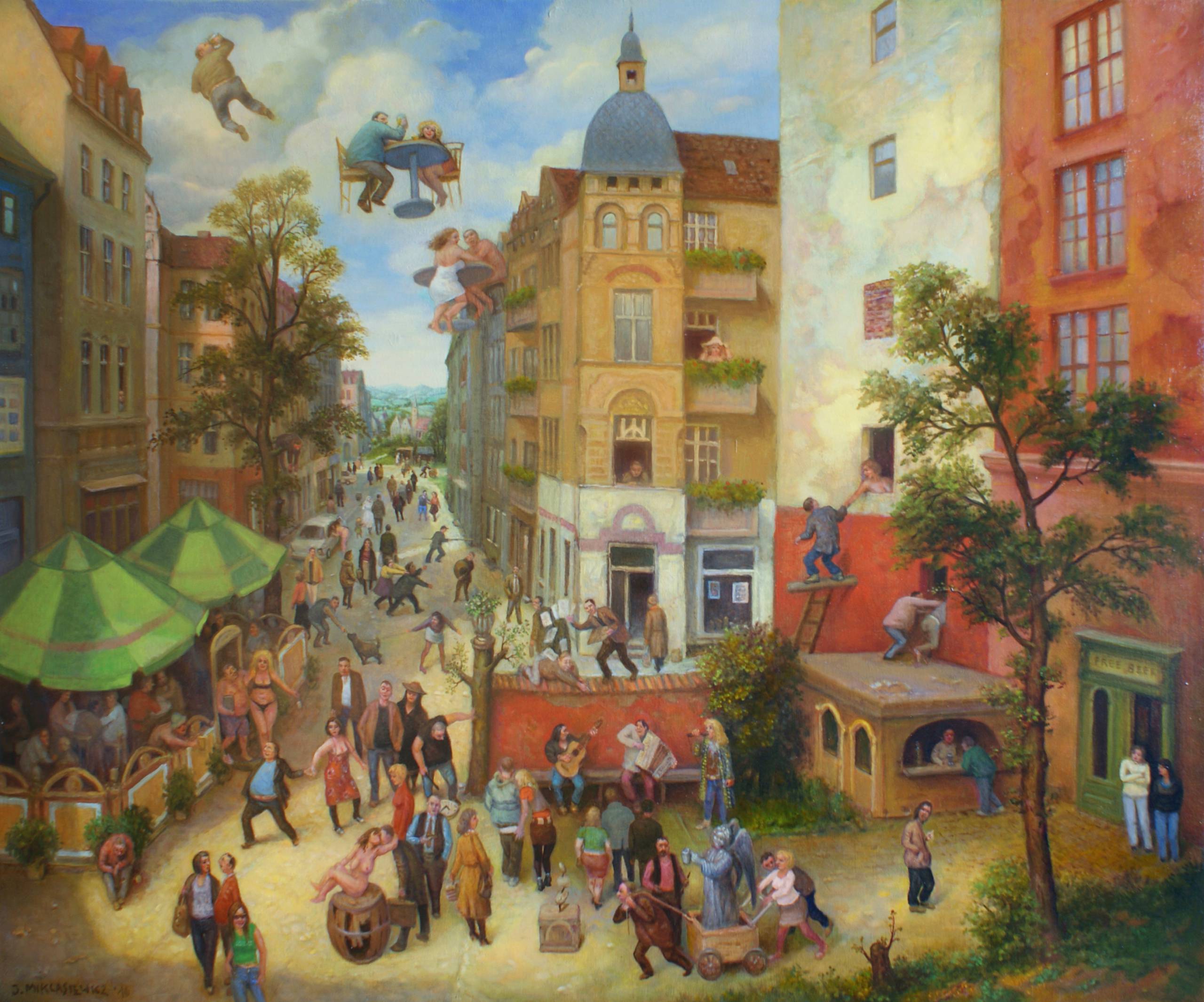 Obraz emanuje feerią kolorów i dynamiczną kompozycją. Na pierwszy rzut oka widać tłum ludzi, budynki i niesamowite postaci unoszące się w powietrzu. Niebo jest jasne, błękitne z białymi chmurami, które dodają całości niezwykłości. Barwy są ciepłe, przeważają odcienie brązu i czerwieni, co nadaje pracy przytulny klimat. Atmosfera tętni życiem, jakby chwila zamrożona w czasie – tłumy poruszają się, rozmawiają, a nad miastem unoszą się meble i ludzie. To surrealistyczna scena, trochę jak marzenie senne, w którym rzeczywistość miesza się z fantazją. Artysta stosuje technikę olejną, co widać po delikatnych pociągnięciach pędzla i miękkich przejściach kolorystycznych. Dzieło to prawdziwa wizualna układanka, pełna detali, które można odkrywać bez końca. Można poczuć radość i odrobinę nostalgii. "I love this", ktoś mógłby powiedzieć, patrząc na tę mieszankę chaosu i harmonii. Dziecko powiedziałoby: "Patrz, ludzie latają jak ptaki!" Obraz pozostawia widza z uczuciem zachwytu i ciekawości, zachęcając do odczytywania osobistych historii ukrytych w każdym rogu płótna. To jak zaproszenie do nieskrępowanej wyobraźni, gdzie wszystko jest możliwe.