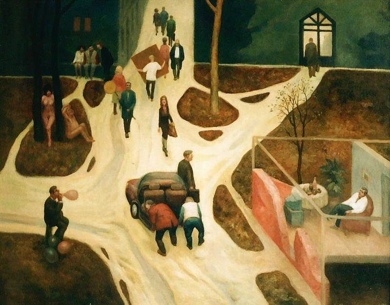 Obraz przedstawia zatłoczoną scenę w mieście lub parku, pełną intrygujących postaci rozrzuconych niby w kalejdoskopie. Dominują tu ciepłe brązy i beże ziemi, które kontrastują z bielą ścieżek przecinających kompozycję. Postacie wydają się być pochłonięte swoimi myślami. Jedni spacerują z psem, inni przysiedli na ławce, a gdzieś, w oddali, kilku młodych ludzi stara się wypchnąć samochód z kałuży. Atmosfera jest enigmatyczna i trochę melancholijna, jakby czas się zatrzymał w miejscu. Artysta zastosował technikę olejną, co nadaje obrazowi delikatną, płynną jakość. Czuć tu lekkość, ale też i pewną ciężkość codzienności. "Look, this looks like a movie scene" – można by rzec, patrząc na tę dziwnie magiczną sytuację. Odbiorca może poczuć nutę nostalgii lub zatrzymać się chwilę, by pomyśleć o swoim własnym dniu. Nastrój obrazka – z jednej strony realistyczny, a z drugiej odrealniony – intryguje i zmusza do refleksji nad mijającym czasem i rutyną. Dla mnie, te wirujące ścieżki są jak labirynt życia.