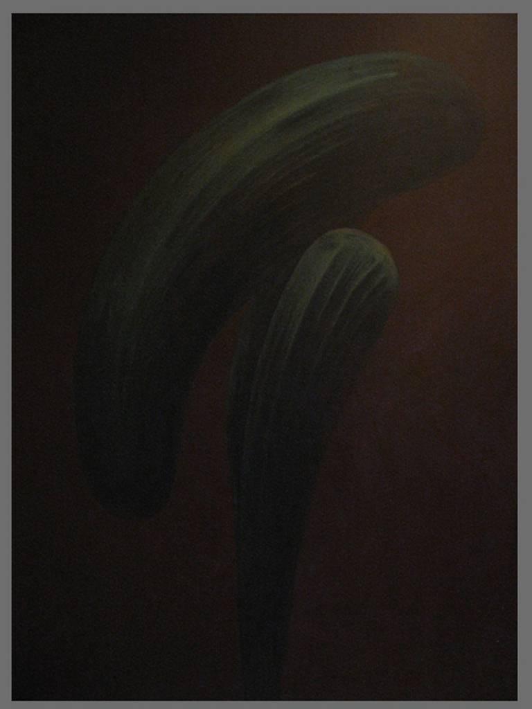 Na obrazie widzimy tajemnicze kształty utrzymane w ciemnych, stonowanych barwach. Dominują tu odcienie zieleni i brązu, które płynnie przechodzą jedno w drugie, tworząc harmonijną kompozycję. Kształty są wydłużone i zakrzywione, co nadaje dziełu dynamiki i pewnej elegancji. Atmosfera obrazu jest dość melancholijna, tajemnicza, jakby skrywała jakąś nieopowiedzianą historię. Może trochę straszy jak się na niego popatrzy za długo, co nie? Dzięki użyciu techniki impasto, tekstura obrazu jest wyczuwalna nawet wizualnie. Artysta bawi się światłem i cieniem, tworząc głębokie, niemal organiczne formy. Niektórym może przypominać to "dreamscape", coś z pogranicza rzeczywistości i marzenia. Widz patrząc na ten obraz, może poczuć spokój, ale jednocześnie lekkie napięcie. Czy to zawałka duszy artysty, czy tylko nasz własny lęk przed nieznanym? Może kogoś skusić do refleksji nad ulotnością chwili. Tu uczucie niepokoju miesza się z fascynacją. Obraz jest jak drzwi do innego świata i tylko od nas zależy, czy mamy ochotę przez nie przejść.