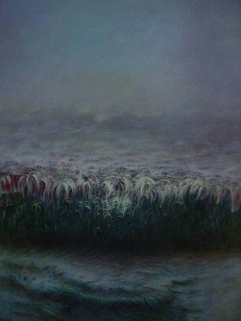 Obraz emanuje mglistą aurą, gdzie dominują przygaszone barwy błękitu i zieleni, które zdają się przenikać jedno w drugie, tworząc tajemniczy pejzaż. Zieleń na pierwszym planie jest nieco ciemniejsza i przypomina pole pełne wirujących kłosów trawy, nad którymi unosi się lekka mgiełka. Krajobraz wydaje się być zanurzony w delikatnym półmroku, jakby dzień dopiero się rozjaśniał. Atmosfera obrazu jest spokojna, lecz niepozbawiona nuty niepokoju, jakby coś kryło się tuż za horyzontem. Artysta posłużył się techniką delikatnych pociągnięć pędzla, które tworzą subtelne, niemal impresjonistyczne tekstury. Kompozycja jest raczej minimalistyczna, ale pełna emocjonalnej głębi. To sprawia, że obraz wydaje się niemal żywy. Wszystko tu szepcze, nie krzyczy. Dla mnie to jak patrzenie przez okno marzeń. Wywołuje uczucie spokoju, ale też lekkiego smutku, prawda? Może przypominać widzowi o ulotnych chwilach lub porankach spędzonych na spacerze po rosie. Imagine yourself wandering through this ethereal scenery, czuć chłód poranka i dotyk wiatru na twarzy. A dziecko by powiedziało: "To wygląda jak magiczne pole, gdzie mieszkają wróżki!"