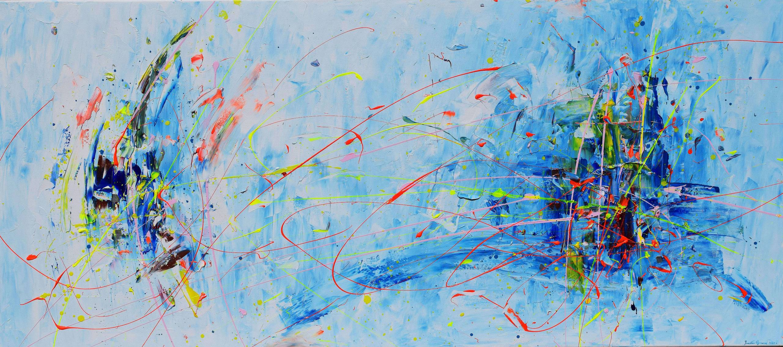 ŚLADY ISTNIEŃ Obraz abstrakcyjny o wymiarach 80x180 cm, 2020 r. Wykonany w technice akrylowej na gotowym, profesjonalnym płótnie, naciągniętym na drewniany blejtram. Zabezpieczony werniksem końcowym, błyszczącym. Krawędzie obrazu zamalowane w kolorze czarnym. Dodatkowa rama nie jest wymagana. Przy pracy artysta użył szpachli malarskiej co spowodowało widoczną, grubą fakturę farby. Niezmiernie energiczny wyraz techniki throw paint Obraz sygnowany oraz z certyfikatem. Idealny do salonu, biura lub sypialni.