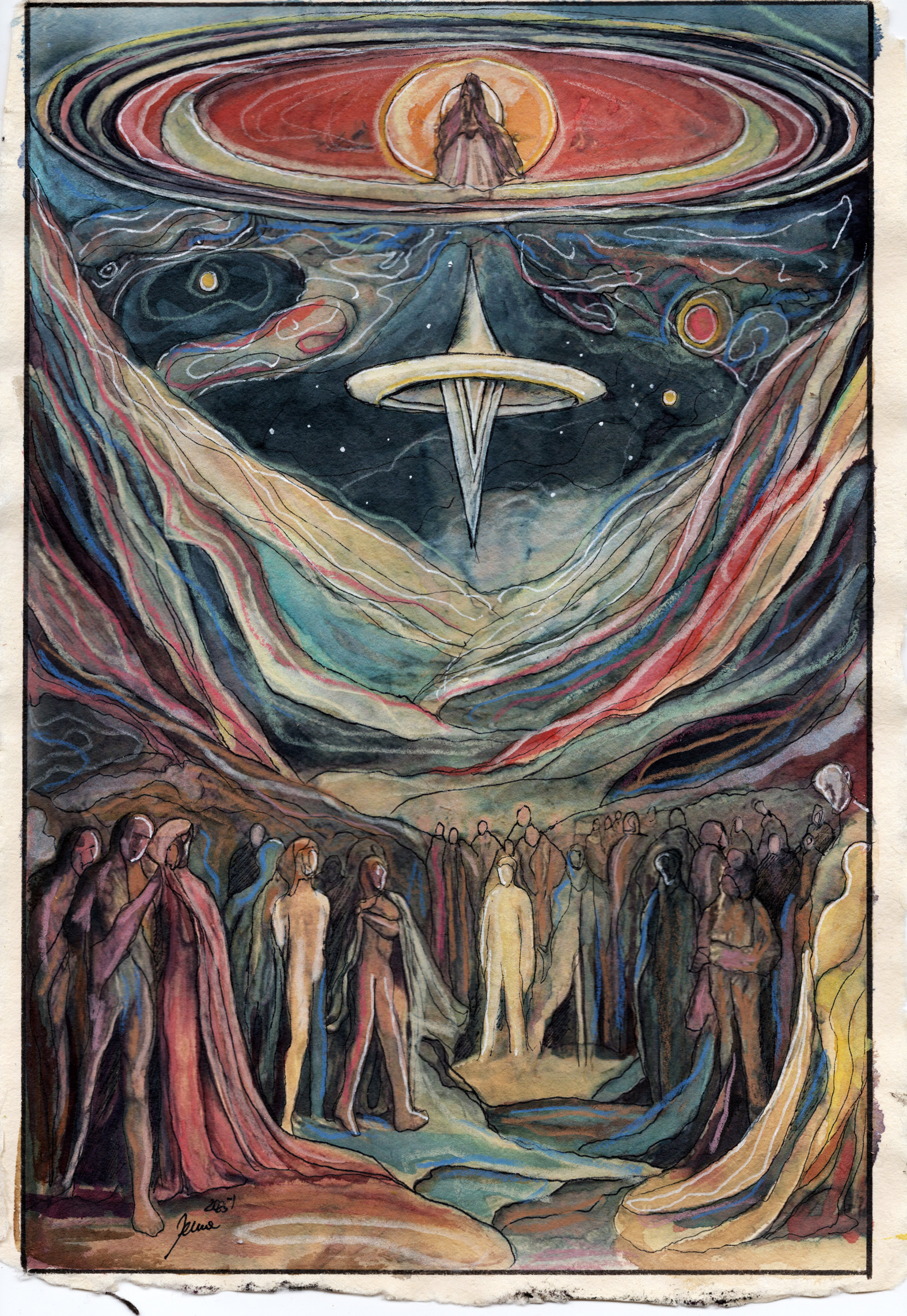 Obraz emanuje tajemniczością i kosmicznym spokojem. Centralnym punktem jest postać w górnej części obrazu, umieszczona w okręgu przypominającym planetę z pierścieniami. Kolory są ciepłe i intensywne, z dominacją czerwieni i pomarańczy, które łagodnie przechodzą w zimniejsze odcienie nieba. W dolnej części widać zgromadzenie postaci - przypominają duchy czy cienie, co nadaje dziełu mistycznego klimatu. Ich sylwetki są ledwie zarysowane, tworząc wrażenie eteryczności. Styl można określić jako surrealistyczny, z delikatnym pociągnięciem pędzla, które dodają lekkości. Technicznie, artysta zastosował miękkie przejścia kolorów i płynne linie, co wzmacnia wrażenie płynności przestrzeni i czasu. Odbiorca może poczuć się jak w innym, magicznym world, gdzie rzeczywistość miesza się z fantazją. Oczywiście, można też dostrzec tu pewne refleksje nad nieznanym i tajemniczym losem ludzkości. Zapewne każdy, kto na to spojrzy, zastanowi się choć przez chwilę: o co w tym wszystkim chodzi?