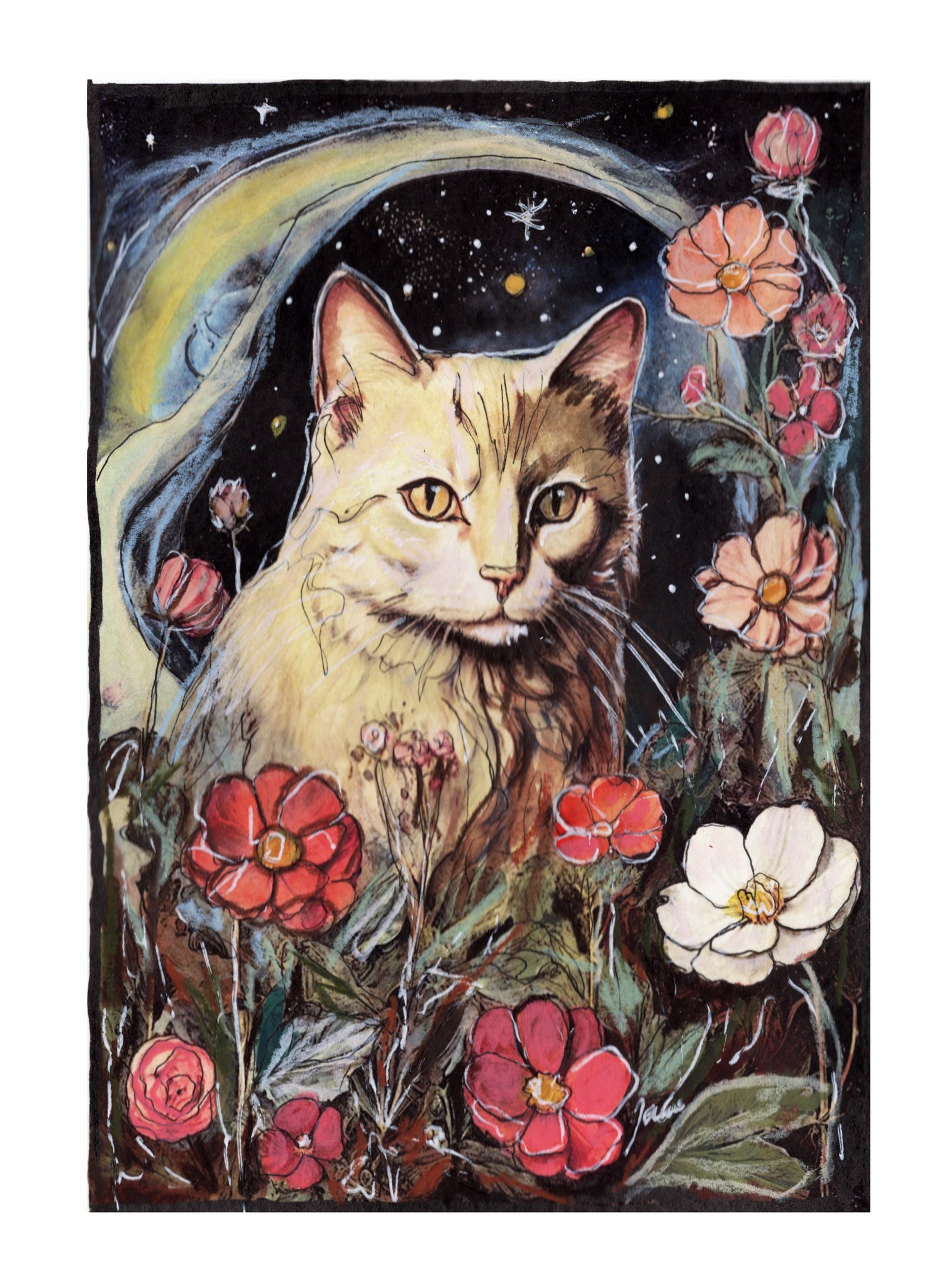 Na obrazie widzimy majestatycznego kota, który dominuje nad wszystkimi innymi elementami. Jego spojrzenie jest pełne tajemnicy, a sierść delikatnie łączy się z otoczeniem, tworząc płynne przejście do bajkowego kosmosu w tle. Kolory są żywe i nasycone, z przewagą głębokich czerni oraz jaskrawych czerwonych i białych kwiatów, które otaczają kota niczym magiczny ogród. Atmosfera jest niemalże kosmiczna, pełna marzeń i cudów, jakbyśmy spojrzeli przez okno do innego świata. Styl obrazu przypomina nieco ilustracje z książek dla dzieci - pełne detali, ale z lekką nutką surrealizmu. Artystyczne połączenie akwareli i tuszu dodaje dziełu świeżości i lekkości, a jednocześnie niezwykłej głębi. Dziecinna radość? No jasne! Patrząc na ten obraz, można poczuć się jak w magicznej bajce, gdzie wszystko jest możliwe, a koty mogą być królami nieboskłonu. Obraz może wywołać u odbiorcy zachwyt i uśmiech, ale też refleksję nad nieuchwytnością i tajemniczością wszechświata. Poczuj to "magic" w powietrzu. Wystarczy jedno spojrzenie, aby zanurzyć się w tym świecie i zostawić codzienne zmartwienia daleko w tyle. To jest coś więcej niż tylko obraz, to emocjonalna podróż do granic wyobraźni.