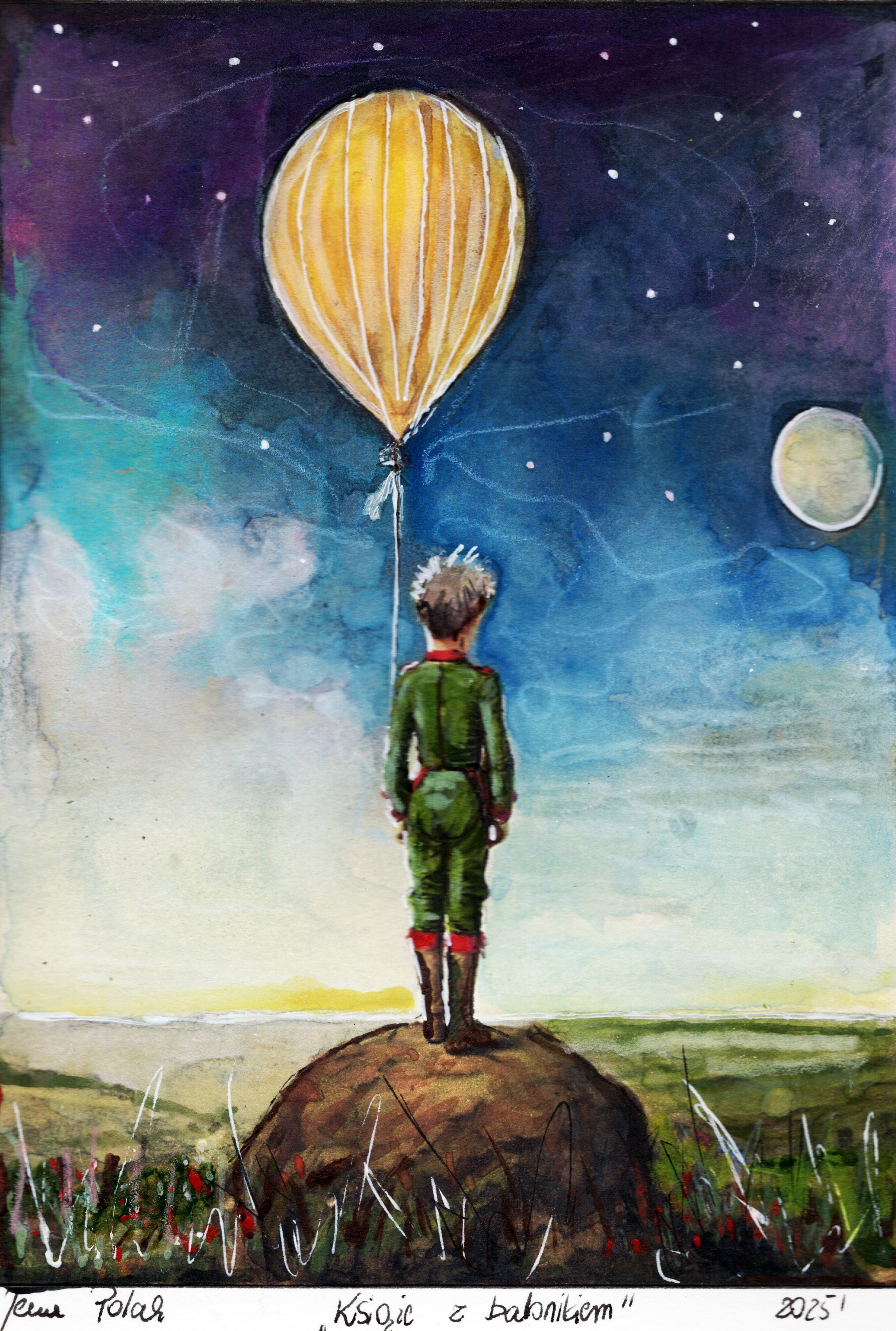 Na obrazie widzimy postać stojącą na niewielkim pagórku, trzymającą żółty balonik unoszący się w stronę gwiaździstego nieba. Dominują tu ciepłe kolory, szczególnie złocisty odcień balonika, kontrastujący z głębokim, granatowym niebem pełnym gwiazd. Efekt ten nadaje kompozycji atmosfery tajemniczości i snu. Styl artystyczny przypomina akwarelę, z delikatnymi, ale zdecydowanymi pociągnięciami pędzla, podkreślającymi miękkość i lekkość sceny. Chłopiec na obrazie, być może mały książę z bajki, kieruje spojrzenie ku górze, co sprawia, że całość wydaje się pełna nadziei i marzeń. Ten mały kawałek ziemi, na której stoi, symbolizuje być może jego własny świat, a balonik - pragnienie wzlotu i odkrywania kosmosu. Wow, chciałbym być tam z nim! To trochę tak, jakby patrzeć na własne dzieciństwo przez magiczne okulary. Ten obrazek dotyka w naszych sercach pudełka pełnego marzeń. Kto nigdy nie chciał złapać gwiazdy? Takie simple dreams często bywają najbardziej touching. Patrzenie na ten obraz przynosi uśmiech i trochę ciepła w sercu, przypominając, że w każdym z nas drzemie dziecko pełne nadziei.