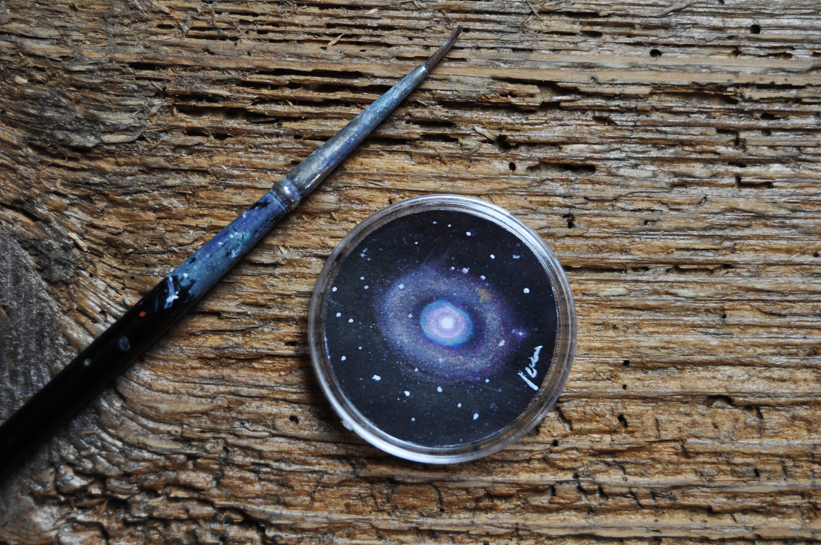 Na drewnianym tle leży mały krążek przypominający okrągłe okno do kosmosu. Widoczna na nim galaktyka lśni odcieniami fioletu, niebieskiego i czerni, przypominając tajemnicę wszechświata. Tuż obok spoczywa pędzelek ubrudzony farbą, jakby właśnie skończył malować nocne niebo. Kora drewna, ze swoimi nierównymi sękami, dodaje całości naturalnego uroku i kontrastuje z czystą formą gwiezdnego obrazu. To połączenie surowości i subtelności jest jak spacer po księżycowej krainie. Atmosfera obrazu emanuje spokojem, choć nie brakuje w niej nuty kosmicznej nieskończoności, budząc w odbiorcy uczucie zaszyfrowanej harmonii. Artysta zastosował technikę drobnych pociągnięć pędzla i subtelnych przejść kolorystycznych, co przywodzi na myśl delikatność akwareli. Wyobraźnia szybciutko gna do przodu, przypominając dziecięce marzenia o podróżach w kosmos. „Kolorki są jak w moim ulubionym kalejdoskopie” – powiedziałoby pewnie dziecko. A ten mały świat, zamknięty w krążku, zachęca do zatrzymania się na chwilę, zastanowienia. Maybe it's a reflection on how small pieces can evoke big emotions. Przyglądanie się temu malowidłu to trochę jak szukanie gwiazdozbiorów na nocnym niebie. rodzaj osobistej medytacji.