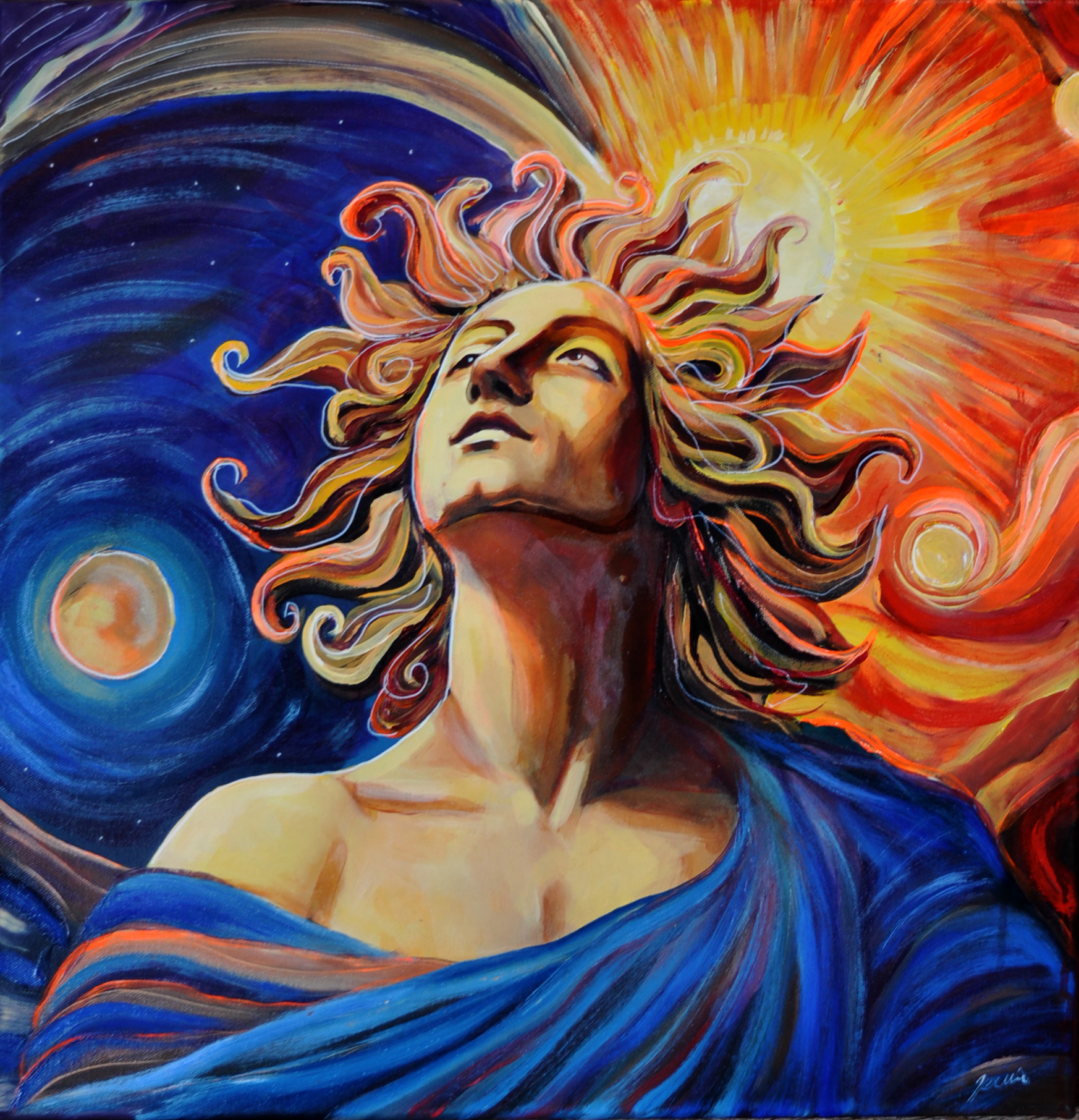 Centralnie widzę popiersie zwrócone ku górze, włosy jak promienie. Po lewej nocny wir granatów z bladym księżycem, po prawej kipiące pomarańcze i żółcie słońca. Kompozycja jest jak przeplot dnia i nocy, rytm łuków pcha wzrok spiralnie. Faktura gęsta, pociągnięcia pędzla szerokie i trochę rozsmarowane, miejscami impasto, światłocień miekki, kolorystyka odważnie bold. Styl miesza symbolizm z ekspresją, może nawet nutka surrealizmu. Pan ma włosy jak ogień i patrzy w niebo. Czuję ciepło i dreszcz, serio daje po głowie. Dla mnie to obraz przebudzenia i pychy, boski ale wciąż ludzki. Myślę o oddechu kosmosu i że czasem trzeba unieść brodę i iść.
