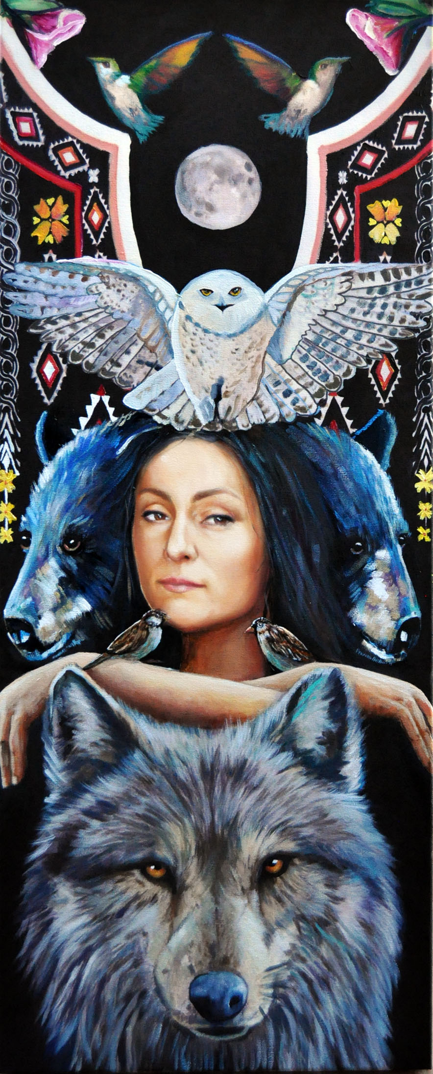 Na czarnym tle wyrasta pionowa kompozycja jak totem, symetryczna i mocna. W centrum spokojna twarz kobiety, otulona przez dwa wilki o srebrzysto niebieskim futrze, a u dołu trzeci patrzy bursztynowymi oczami. Nad jej czołem unosi się biała sowa, dalej trzepoczą koliberki, a po bokach błyszczą etniczne wzory czerwieni, bieli i żółci. Księżyc jak pieczęć światła. Faktury są gęste, czasem rozcierane, jakby artysta mieszał laserunek z impastem. Całość pachnie magią i dziką ciszą, trochę wild. Pani ma wilki i sowę nad głową i to jest super. Czuję opowieść o strażnikach i przyjaźni ze zwierzętami, takie naprawde bliskie. Interpretacja idzie ku mitom i kobiecej mocy, ale też do zwykłej tęsknoty za lasem. Chwile patrzę i jest mi ciepło, choć srogość oczu lekko kłuje.