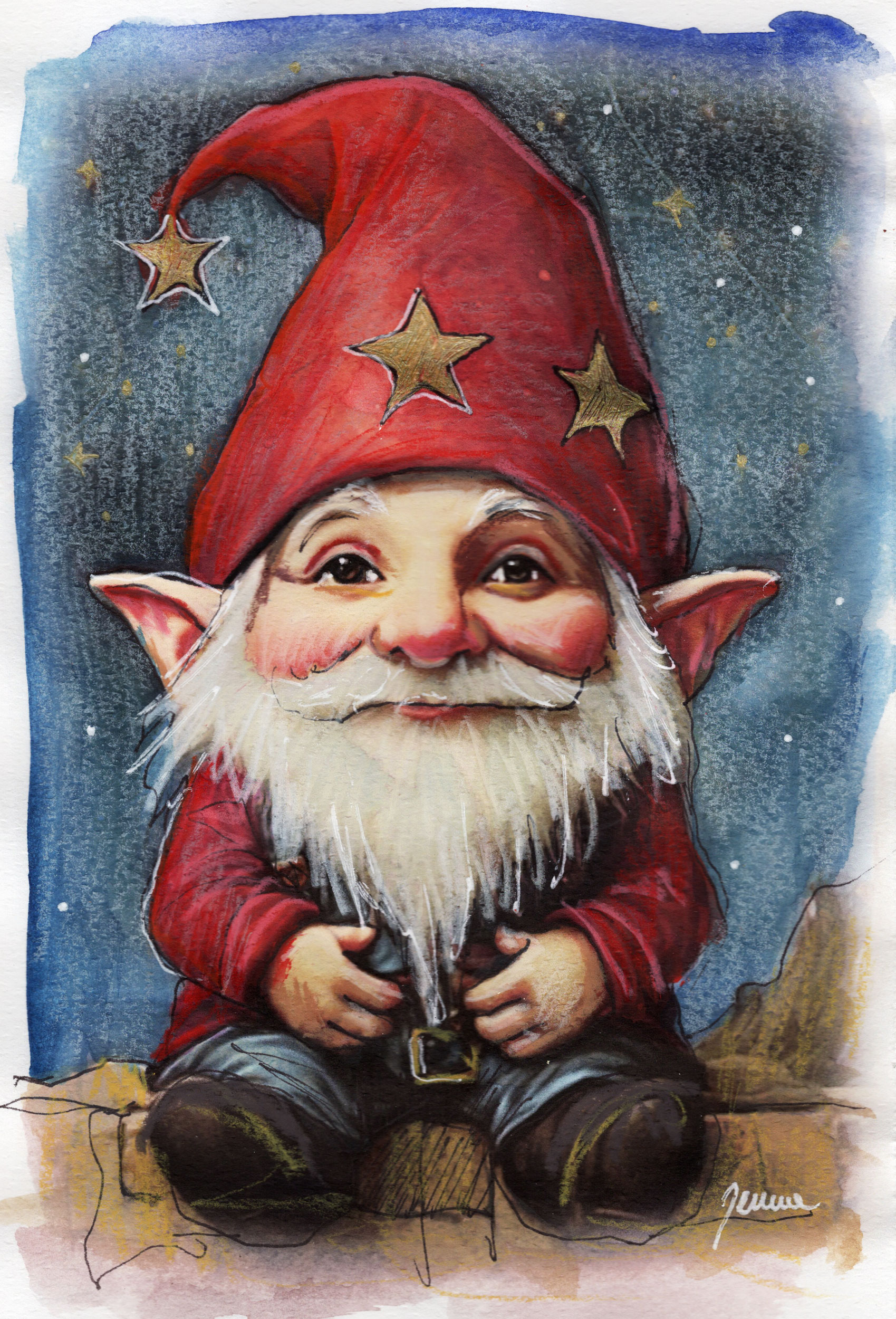 Na obrazie siedzi krasnal z ogromną czerwoną czapką naszytą trzema złotymi gwiazdami na tle granatowej nocy pełnej drobnych iskierek. Miękkie cienie i kredkowe przetarcia budują okrągłą twarz różowe policzki spiczaste uszy i puchatą brodę która niemal świeci. Kompozycja centralna trójkąt czapki domyka całość a gwiazdy powtarzają się w tle. Atmosfera spokojna trochę senna bardzo cozy. Widać akwarelowe plamy i suche pociągnięcia chyba miks technik uroczo niedoskonały kontur. On jest malutki i miły i ma wielką czapkę. Czuję ciepło i bezpieczny humor jakby pilnował snu. To opowieść o życzliwości i cierpliwym czekaniu w przmijającej ciszy. Chciałbym usiąść obok i posłuchac nocy.